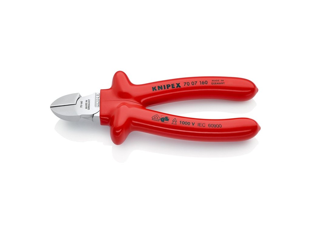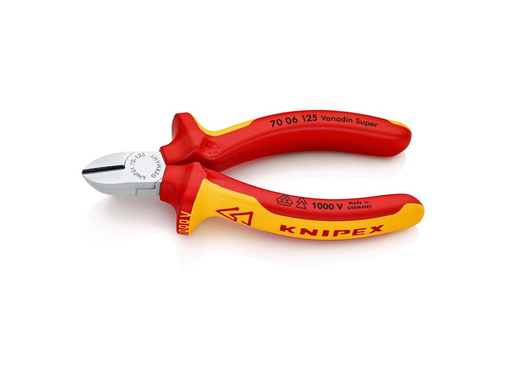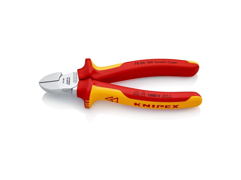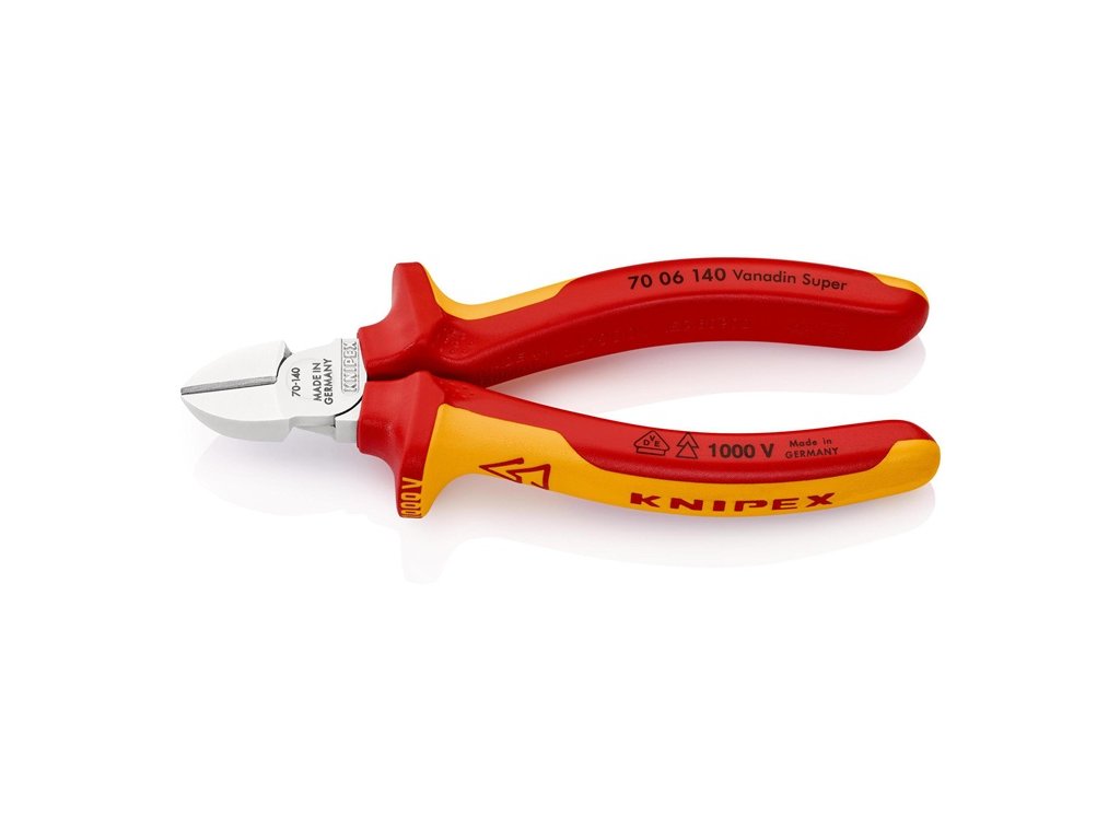 VDE izolované do 1000 V - vyrobené podľa DIN EN/IEC 60900, kusovo testované - štíhly tvar hlavy - čistý rez na tenkých medených drôtoch, aj na koncoch ostria - ostrie dodatočne kalené, tvrdosť ostria cca. 62 HRC - vanádiová elektrická oceľ, kovaná, viacstupňovo kalená v olejiChrómované kliešte