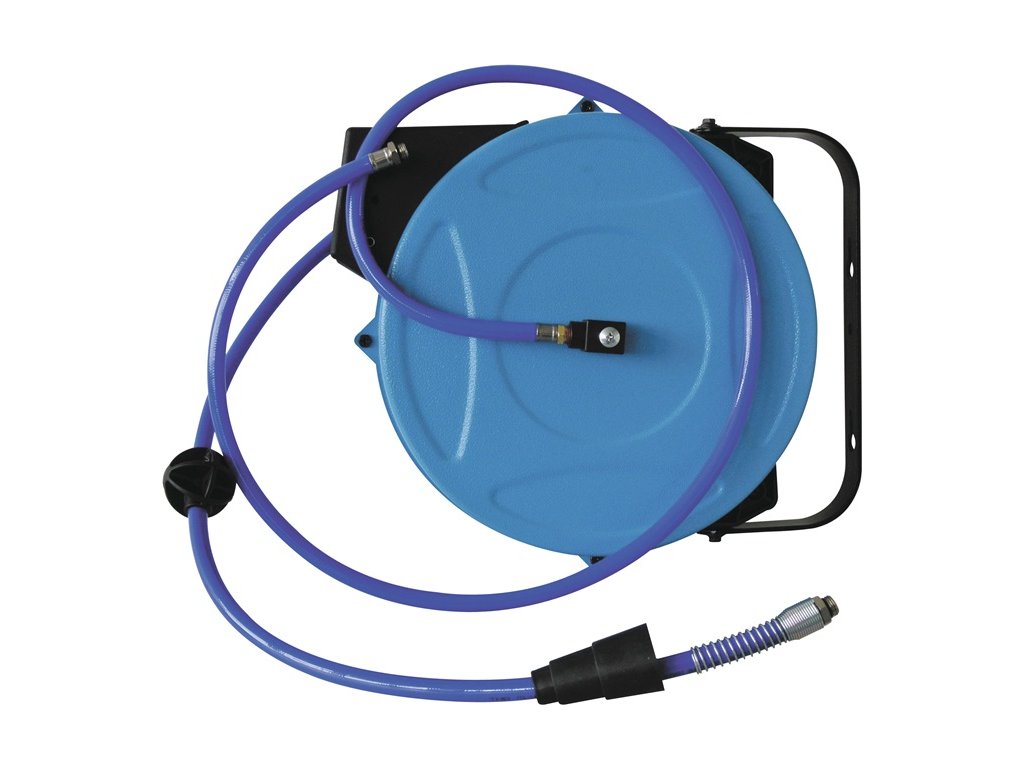 s automatickým spätným zámkom a jednoduchým uvoľnením pre vzduch a vodu - s PU hadicou s textilnou vložkou, s pružinou proti zalomeniu. Kovové puzdro odolné proti nárazom, na vnútorné aj vonkajšie použitie - Otočná oceľová konzola na montáž na stenu a strop - So zámkom, ktorý možno vypnúťDodatočné parametre