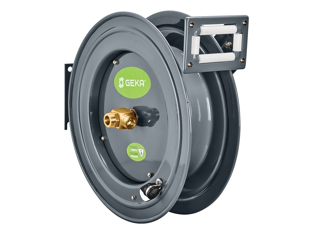 automatické navíjanie hadice s jemným vedením hadice - postupné zaisťovanie možné z diaľky ťahom za hadicu - s ochranou hadice a hadicovou zátkou - s otočnou armatúrou GEKA® plus 90° pod uhlom z mosadzeMateriál: Puzdro: oceľ s práškovou povrchovou úpravou, vedenie hadice: biely plast, hadicová zátka: čierna guma, GEKA® plus šikmá otočná armatúra: mosadz