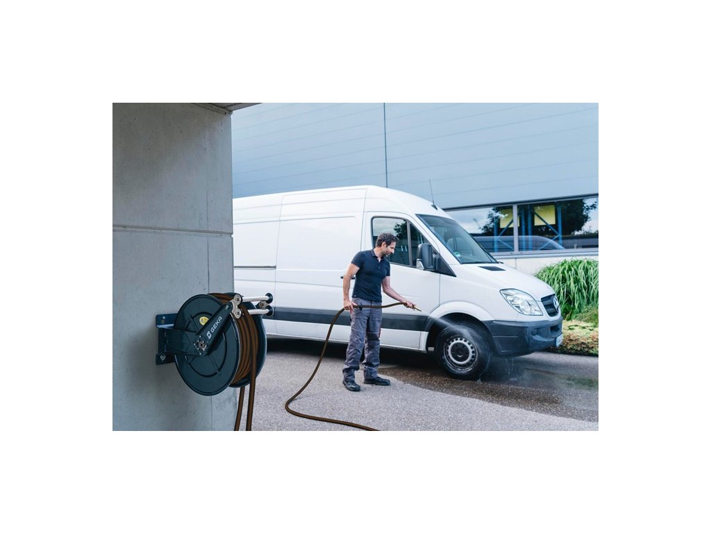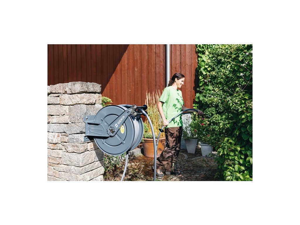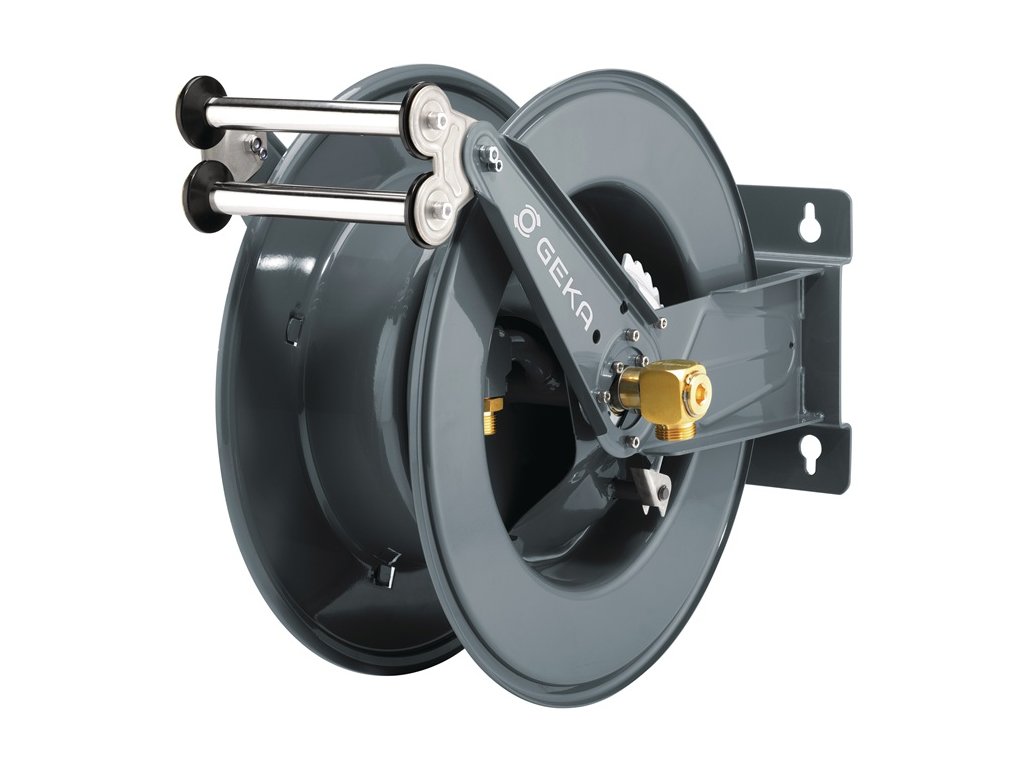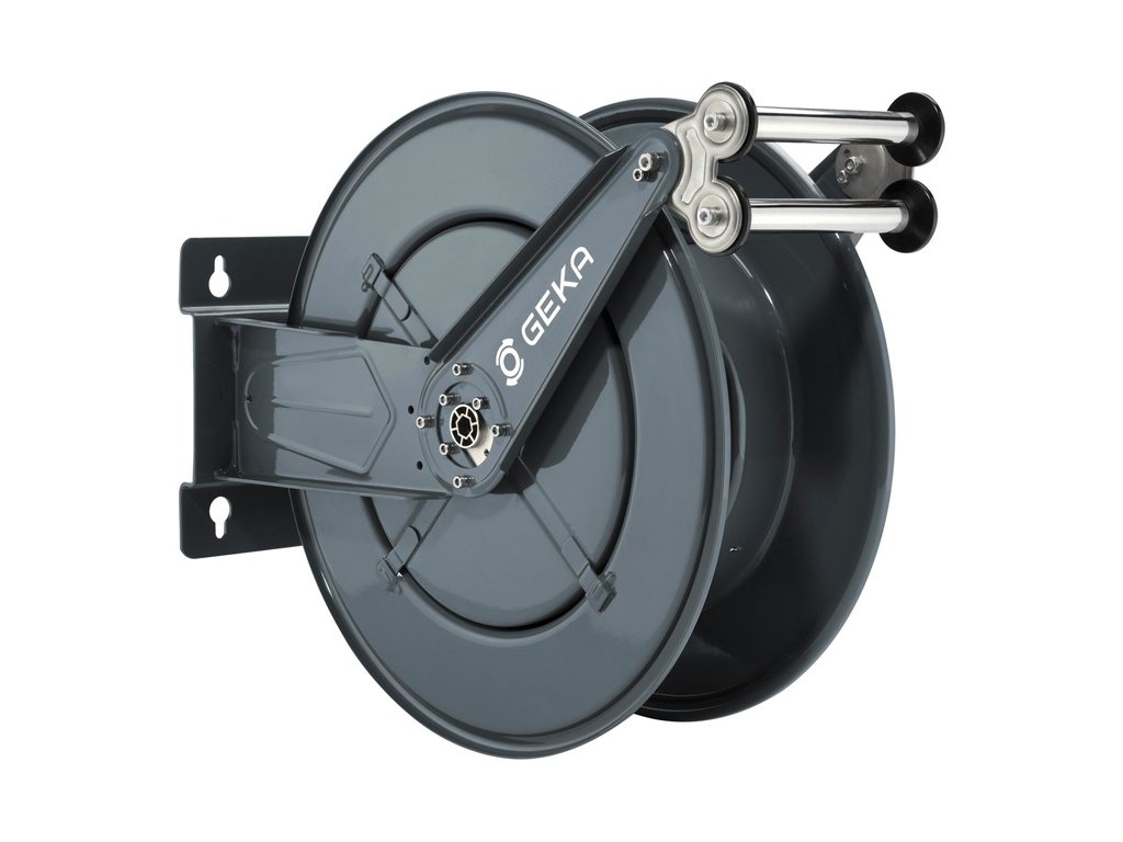 automatické zasunutie hadice - možnosť postupného zaistenia na mieste z diaľky zatiahnutím za hadicu - vhodné na vodu - s ochranným krytom hadice a hadicovou zátkou - s mosadznou otočnou armatúrou GEKA® plus s uhlom 90°Materiál: Puzdro: oceľ s práškovou povrchovou úpravou - Vedenie hadice: Nerezové valčeky, držiak z nehrdzavejúcej ocele, hadicová zátka: čierna guma - Prívodná rúrka, blokovací mechanizmus (ozubený kotúč, západka, pružina, poistný krúžok), skrutky, ochranná pružina hadice: nehrdzavejúca oceľ - Otočná armatúra GEKA® plus s uhlom 90°: mosadz