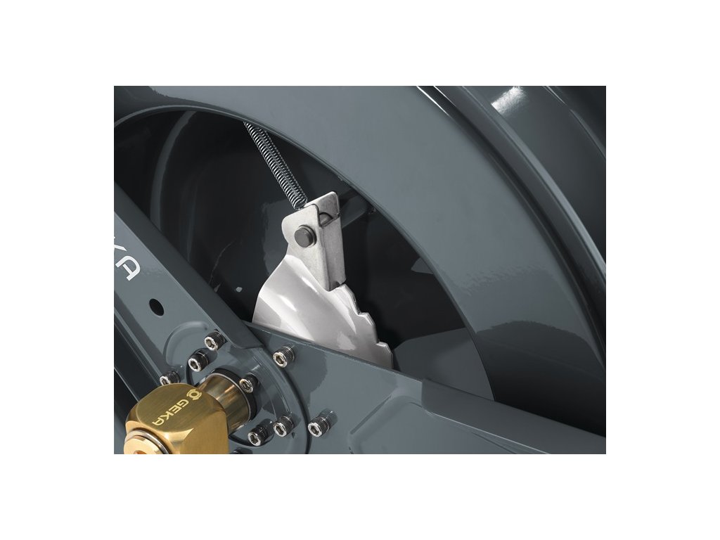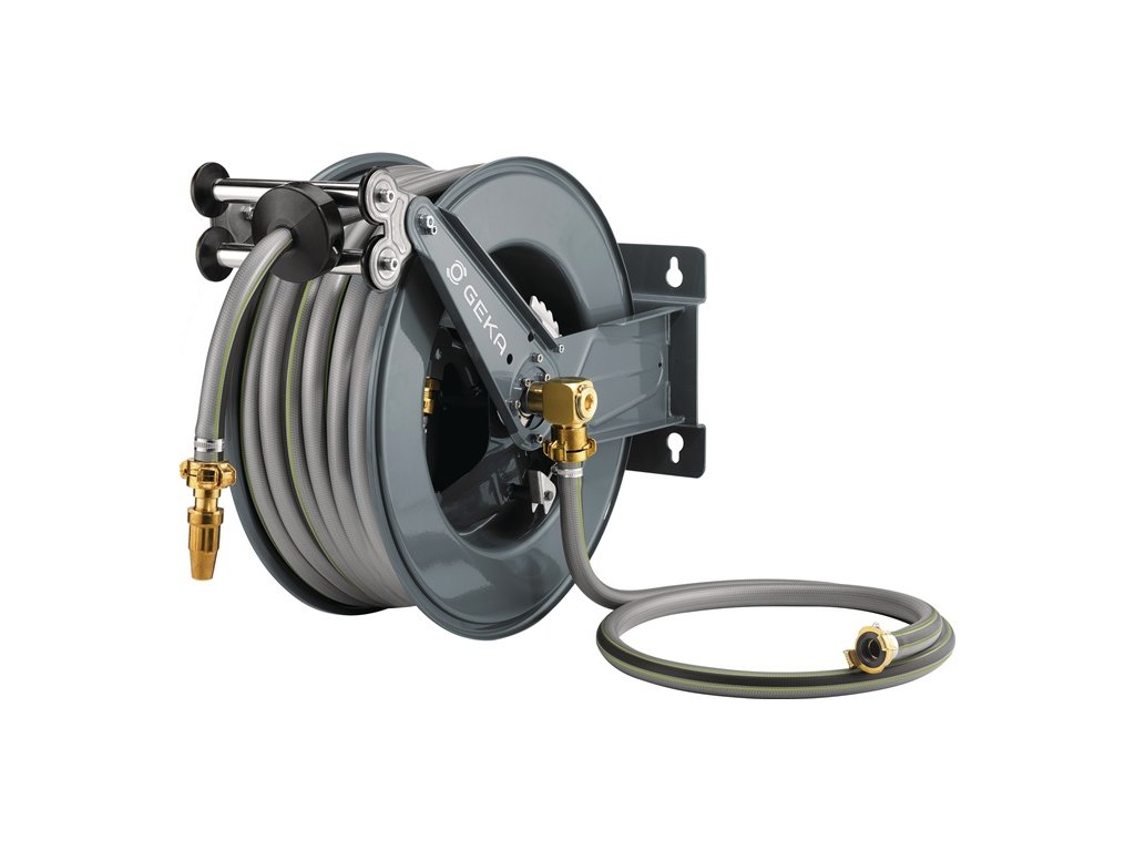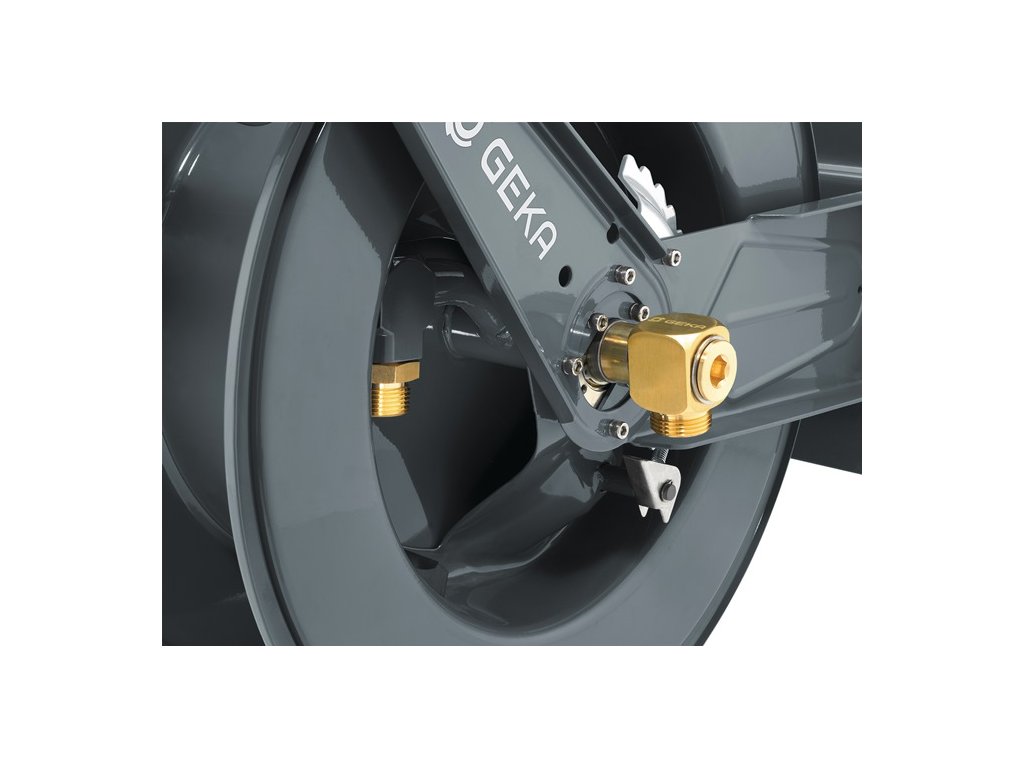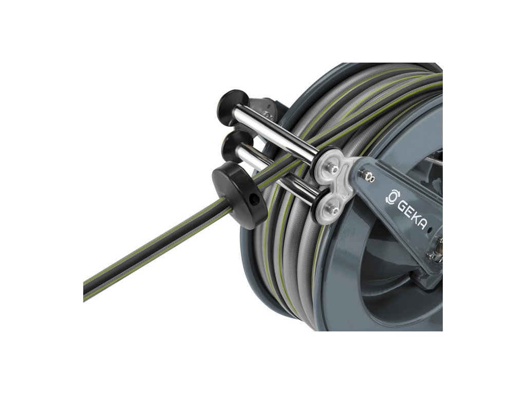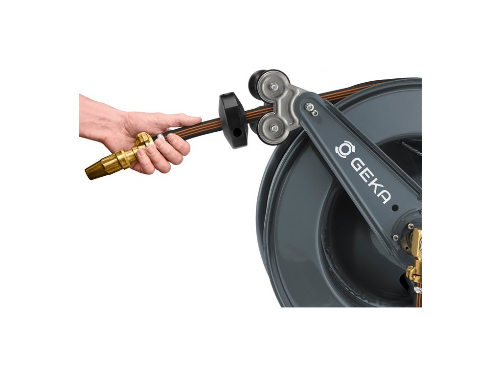 automatické zasunutie hadice - postupná aretácia možná z diaľky potiahnutím za hadicu - vhodné na vodu - s uhlovou otočnou armatúrou GEKA® plus 90° z mosadzeMateriál: Kryt: oceľ s práškovým nástrekom - Vedenie hadice: Valčeky z nehrdzavejúcej ocele, držiak z nehrdzavejúcej ocele - Zarážka hadice: Čierna guma - Prívodná rúrka, blokovací mechanizmus (ozubený kotúč, západka, pružina, poistný krúžok) - Skrutky, ochranná pružina hadice: Nehrdzavejúca oceľ GEKA® plus šikmá otočná armatúra: Mosadz
