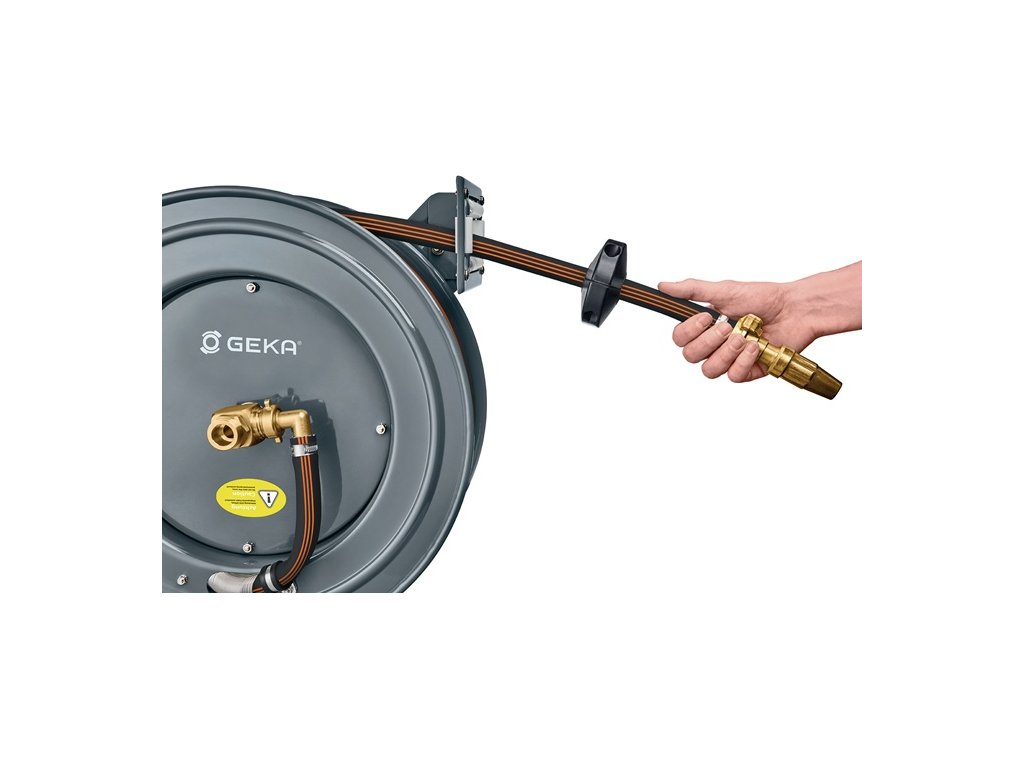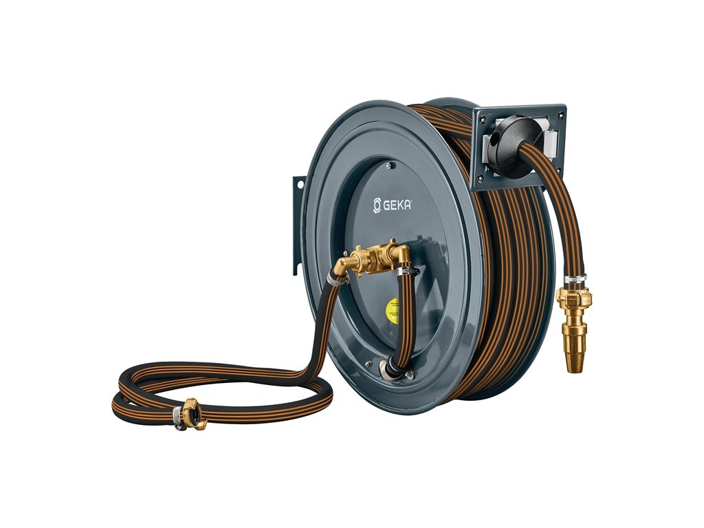 Automatický hadicový bubon GEKA® plus - práškovo lakovaná oceľová konštrukcia - automatické navíjanie hadice - na montáž na stenu, podlahu a strop - kompletne zmontovaný a pripravený na použitie - otočný nástenný držiak je k dispozícii samostatneMateriál: Kryt: práškovo lakovaná oceľ