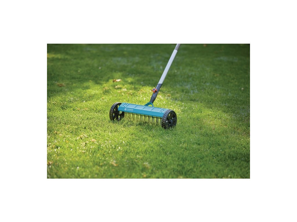na odstraňovanie machu, buriny a trávnikovej plste - vymeniteľné nástavce - špeciálna čepeľ s posuvným chrbtom z nehrdzavejúcej ocele - kolesá so špeciálnym profilom - povrchová úprava duroplastDodatočné parametre