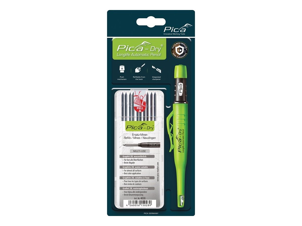 vrátane náplne - špeciálna grafitová náplň umožňuje značenie na takmer všetkých povrchoch materiálov, či už suchých, vlhkých, hladkých, drsných, zaprášených alebo mastných - z hladkých povrchov sa dá zotrieť vlhkou handričkou - integrovaný brúsik s dlhou životnosťou - so zarážkou valčeka - tlakový mechanizmus na automatické podávanie náplne - možnosť opätovného naplneniaDodatočné parametre