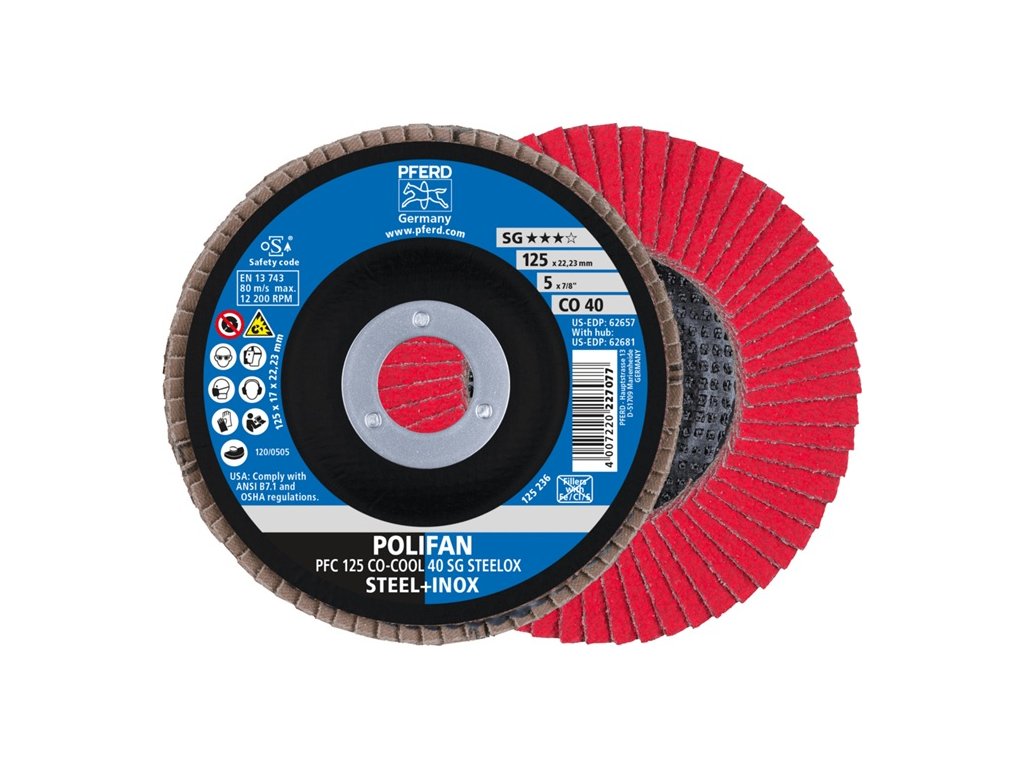 Keramické zrno s aktívnym brúsením, chladiacim povlakom (COOL) - samoostriace sa keramické zrno zabezpečuje optimálne výsledky práce na ťažko opracovateľných materiáloch, ako je vysokolegovaná a hrdzavá oceľ, zliatiny na báze niklu a titánu - na brúsenie povrchu, opracovanie zvarových švov, zrážanie a odstraňovanie otrepov z nehrdzavejúcej ocele (INOX), ocele, valcovaného plechu, zliatin na báze niklu a hliníkových zliatin (tvrdé) -Dodatočné parametre