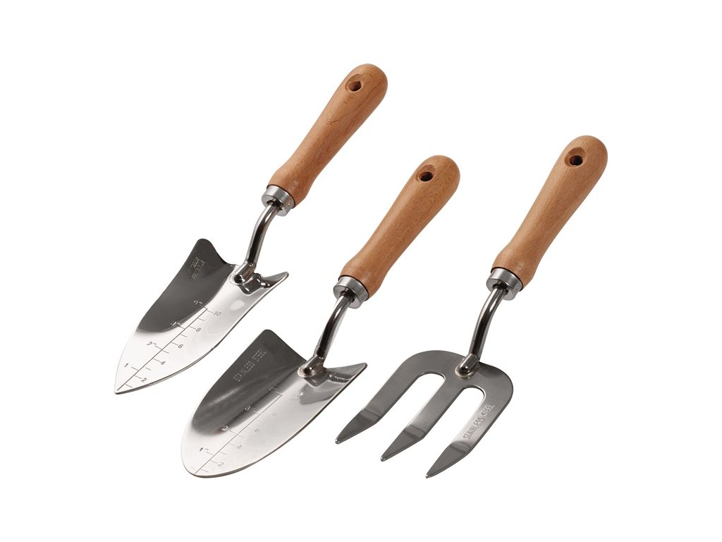 ideálna na sadenie alebo presádzanie v záhrade alebo na balkóne - súprava pozostáva zo sadiacej lopatky, hladidla a sadiacich vidlíc - vyrobená z nehrdzavejúcej ocele s drevenými rukoväťamiDodatočné parametre