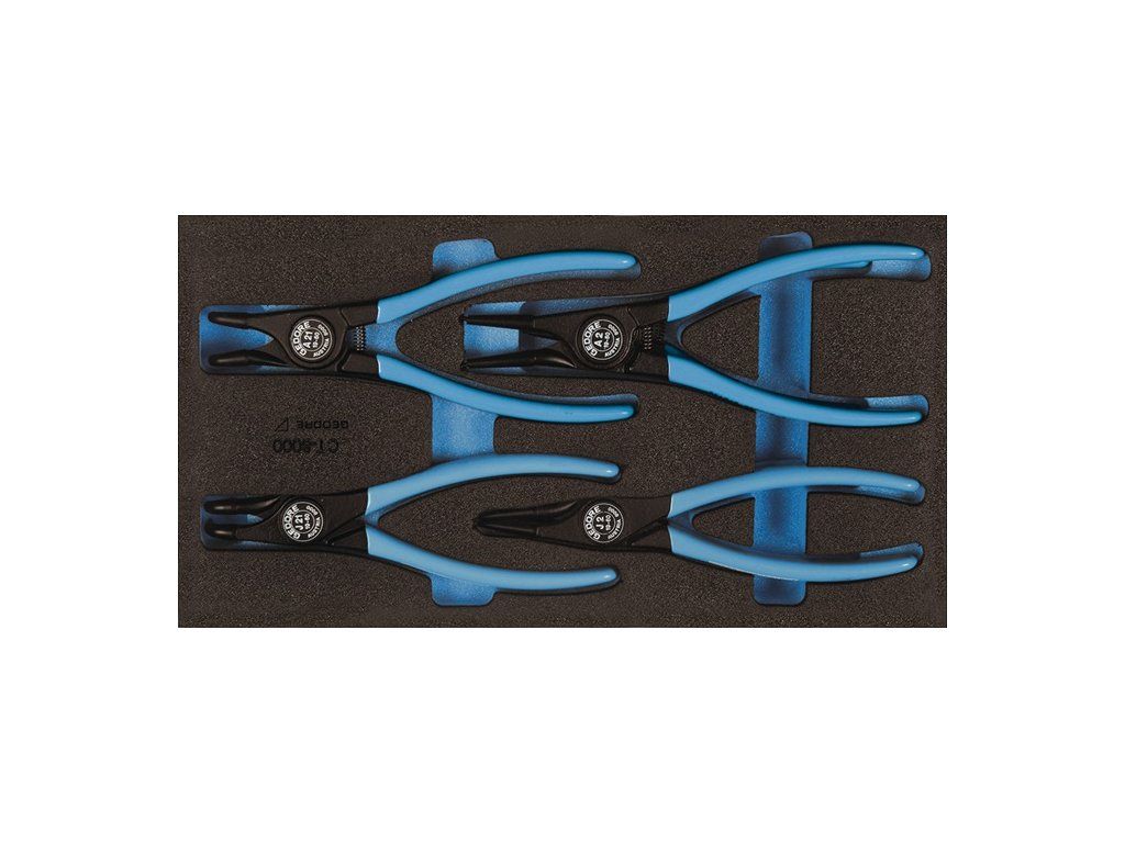 (1/3 modulu) s kliešťami na poistné krúžky (vonkajšie a vnútorné poistné krúžky) - s rovnými a šikmými čeľusťami - vyrobené z chróm-vanádiovej špeciálnej kalenej a popúšťanej oceleObsah pre vonkajšie poistné krúžky (čierne, s modrou namáčanou ochranou rukoväte, ochrana proti zachyteniu):