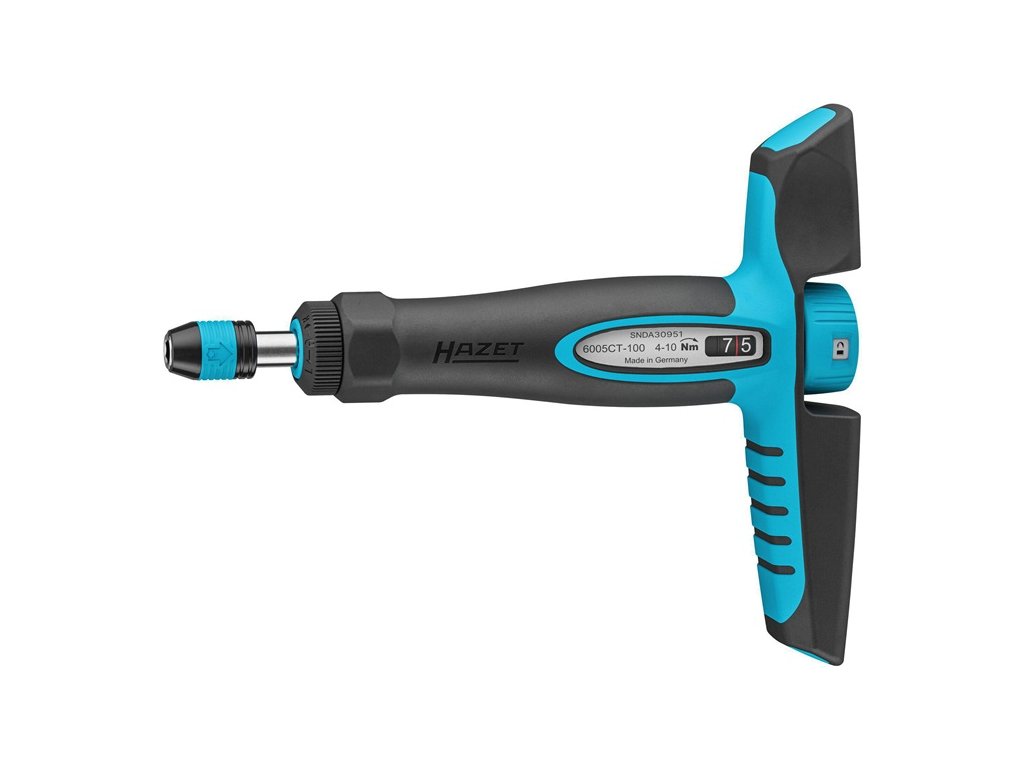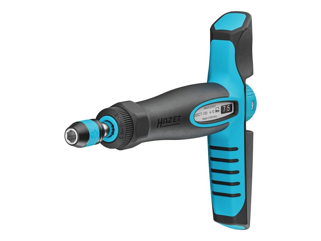 "Ráčnová funkcia" s voľnobežným mechanizmom - reverzibilná vpravo - vľavo - pevná ∙ Umožňuje rýchlu prácu vďaka plynulému nadväzovaniu pri obsluhe skrutkových spojov aj v stiesnených montážnych priestoroch - Vynikajúca čitateľnosť nastavenia krútiaceho momentu vďaka veľ, prehľadný číselný displej - krátka dráha uvoľnenia 36° s ergonomickým správaním pri uvoľňovaní a zreteľne počuteľným signálom - držiak bitov s rýchloupínačom - rýchla výmena bitov jednou rukou - uvoľňovací mechanizmus z vysokolegovanej nástrojovej ocele s vynikajúcou odolnosťou proti opotrebovaniu - prekročeniu nastaveného krútiaceho momentu zabraňuje preťažovacia spojka ("klzák") - ľahko rozpoznateľný stav uzamknutia pomocou zámkusymboly - s kalibračným certifikátom a sériovým číslom - možnosť kalibrácie a opravy v servisnom stredisku HAZET v Remscheide - ergonomická dvojzložková T-rukoväť HAZET - testovaná podľa normy DIN EN ISO 6789-2:2017 - výstup: 1/4 palca (6,3 mm) - dutý šesťuholník - na ručné ovládanie - presnosť: 6 %Dodatočné parametre