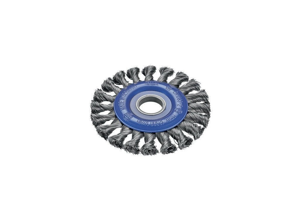 uzlovitá okrúhla kefa v priemyselnej kvalite na univerzálne použitie na všetkých štandardných uhlových brúskach - agresívne a rýchle čistenie - všetky drôtené hroty sú v prevádzke súčasne - dlhá životnosť - certifikát TÜV-Süd (testovaná bezpečnosť - kontrolovaná výroba) - na zdrsňovanie, odstraňovanie otrepov a jednoduché práce pri odstraňovaní hrdze oceľ, nerezová oceľ - otvor 22,2 mm ØDodatočné parametre