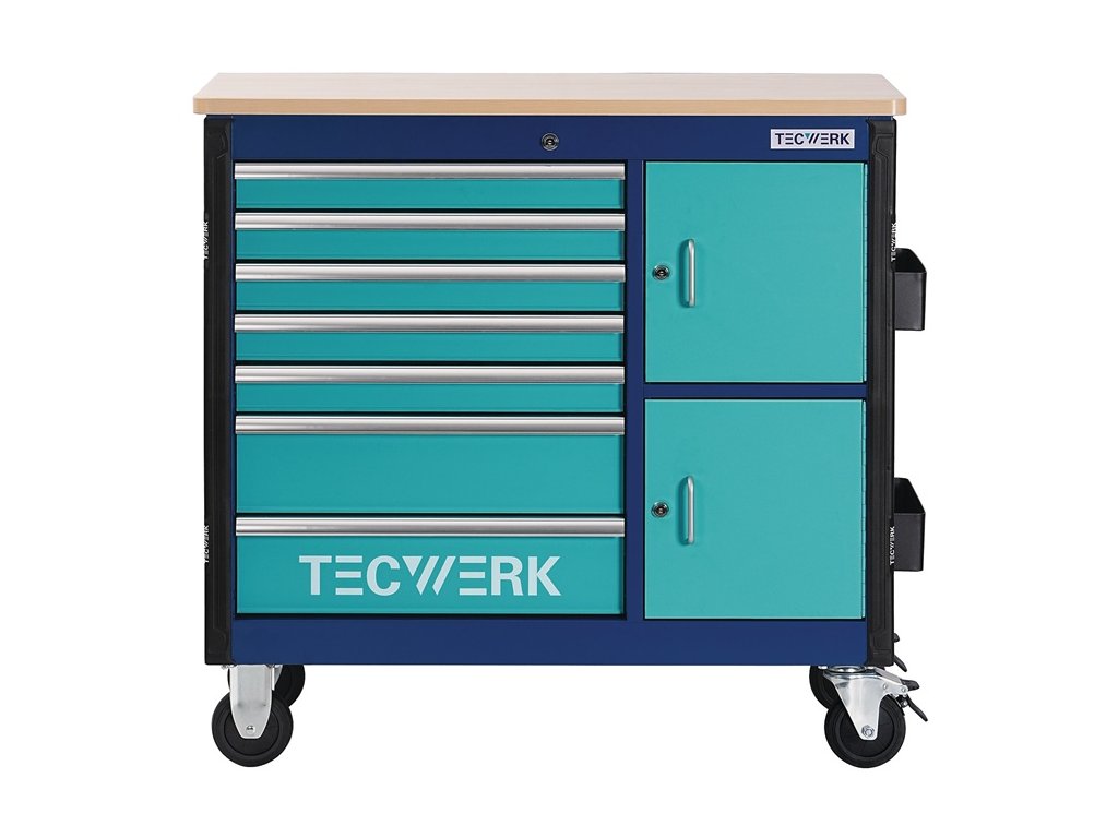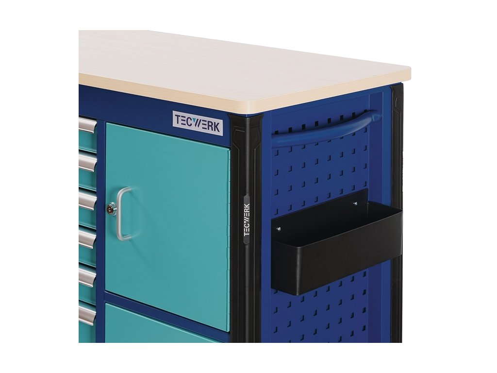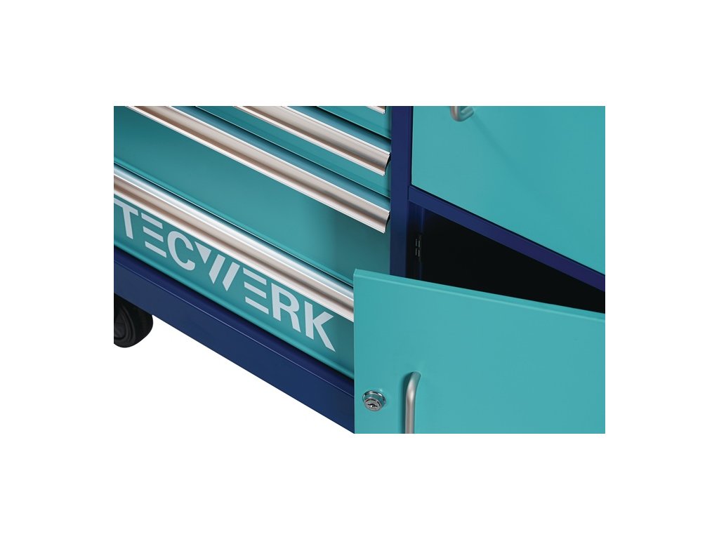 so 7 zásuvkami - úchytka - uložená v guľôčkových ložiskách, teleskopické výsuvy so 100 % výsuvom zásuviek, každá s protišmykovou podložkoub>- automatické vysúvanie zásuviek - označovanie zásuviek - robustná odkladacia plocha pozostávajúca z dosky MDF s hrúbkou 25 mm - deliaca súprava pre 4 zásuvky v cene - s centrálnym zamykaním (vždy otvorená len jedna zásuvka) - 2 uzamykateľné priehradky s dvierkami (na rovnaký kľúč ako zásuvky) - uzamykateľné pomocou zabudovaného cylindrického zámku so 4 kľúčmi - vysokokvalitné PVC kolieska Ø 127 mm - 2 pevné a 2 otočné kolieska s aretáciou - systém perforovaných stien na oboch stranách (9 x 9 mm) - na jednoduchú inštaláciu príslušenstva -Rozmery v kompletne zmontovanom stave s rukoväťou a kolieskami (š x h x v) 1090 x 500 x 1055 mmbr>