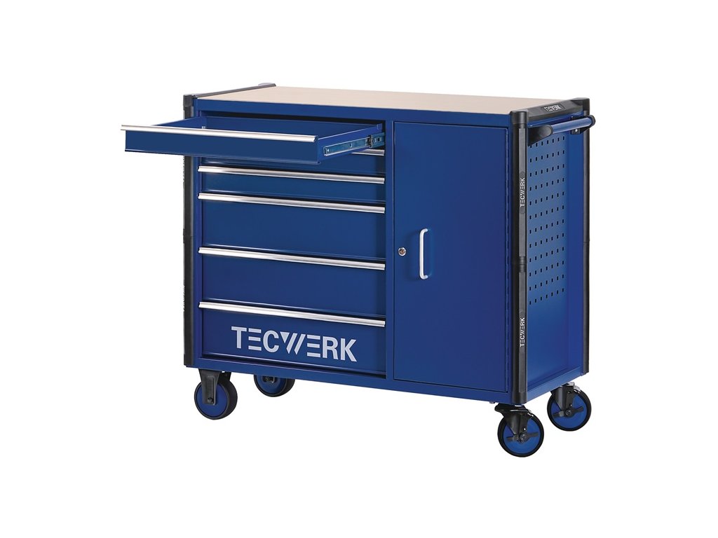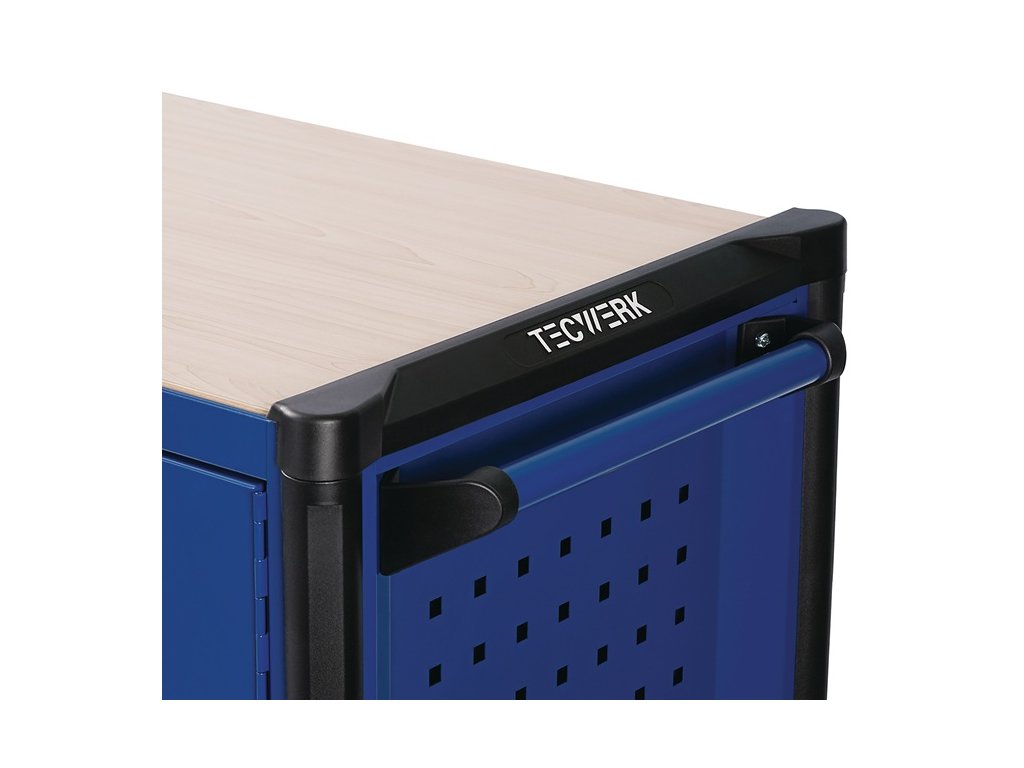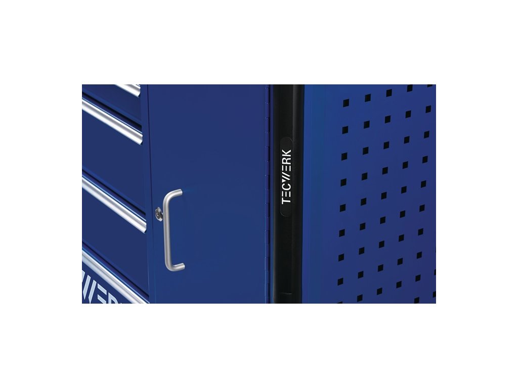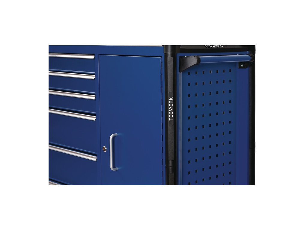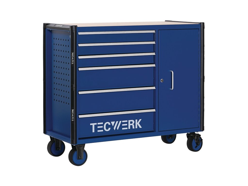 s 6 zásuvkami - rukoväť - Montované guľôčkové ložiská, teleskopické výsuvy na vysunutie zásuviek so 100 % výsuvom každý s protišmykovou podložkou - automatické vysúvanie zásuviek - polička z MDF - Deliaca súprava pre 4 zásuvky v cene - s centrálnym uzamykaním (vždy otvorená len jedna zásuvka) - uzamykateľná pomocou zabudovaného cylindrického zámku na boku so 4 kľúčmi - PP kolieska Ø 127 mm - 2 pevné a 2 otočné kolieska s brzdou - systém perforovaných stien na oboch stranách (9 x 9 mm) na jednoduchú inštaláciu príslušenstva - bočná priehradka s dvierkami a 2 policami - uzamykateľná (v línii so zásuvkami) - b>priebežná, bočná ochrana hránCelkové rozmery v zloženom stave s rukoväťou a kolieskami (š x h x v) 1105 x 470 x 950 mm