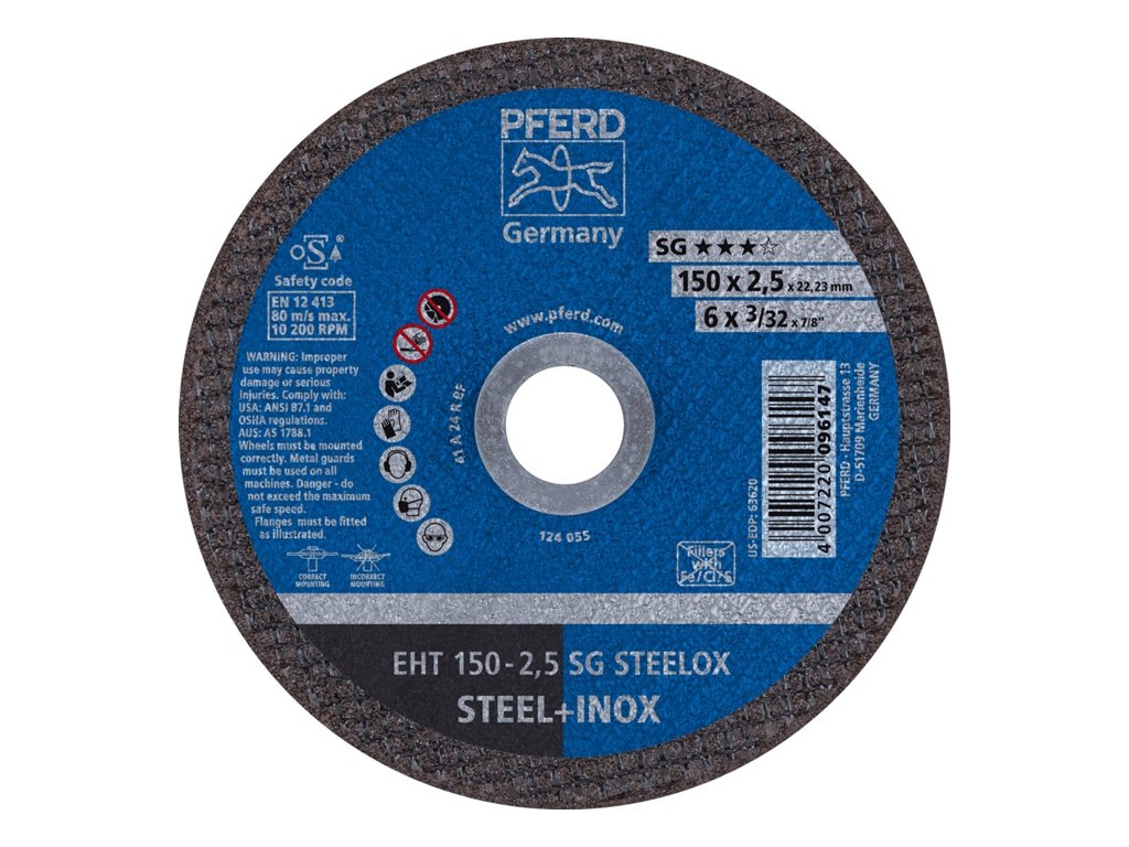 na spracovanie nehrdzavejúcej ocele (INOX), ocele, plechov, profilov a plného materiálu - vysoký rezný výkon a maximálna životnosť - hrúbka kotúča 1,0/1,6/1,9 mm na rýchle, pohodlné a nenáročné rezanie - hrúbka kotúča 2,4/2,5 mm na univerzálne rezné úlohy - vrt 22,23 mm ØDodatočné parametre