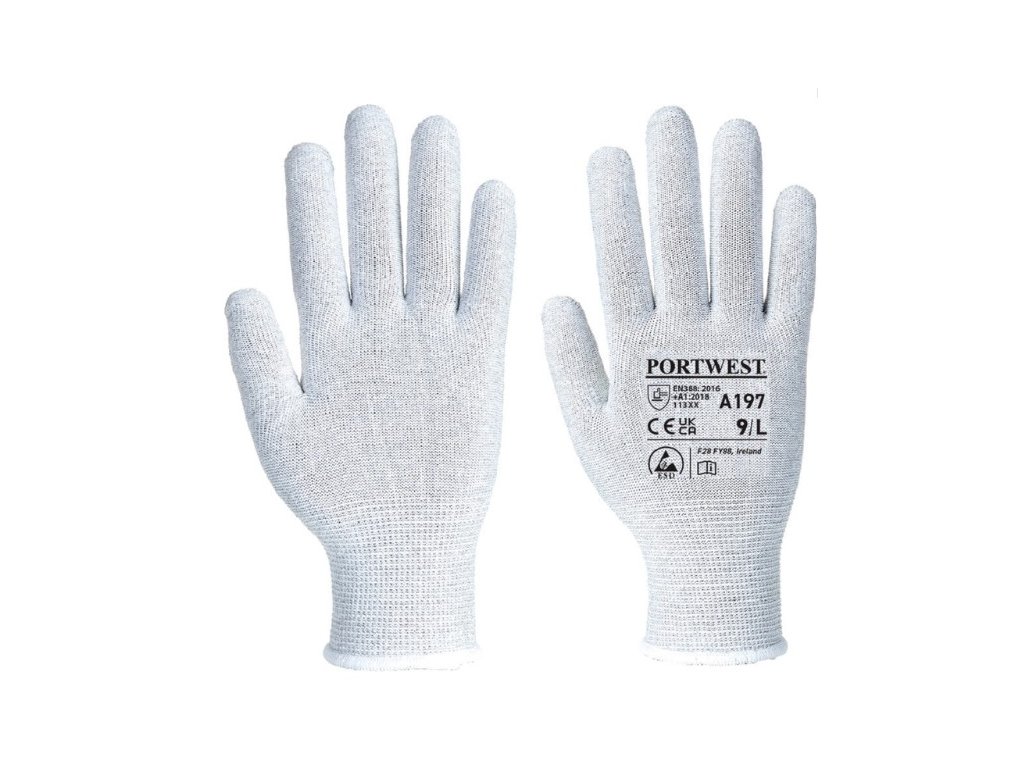Rukavice sú vyrobené zo zmesi nylonu a uhlíkového vlákna. Táto rukavica chráni zariadenia, ako sú dosky plošných spojov, pred prírodnými mastnotami pokožky a zároveň chráni citlivé zariadenia pred škodlivým statickým výbojom. Vhodné na použitie v prostrediach ESD. Túto rukavicu je možné používať na väčšine zariadení s dotykovou obrazovkou. Nízko plznúca konštrukcia pre minimálnu kontamináciu. Bezšvové, hrúbka 13. Materiál polyester a uhlíkové vlákno.