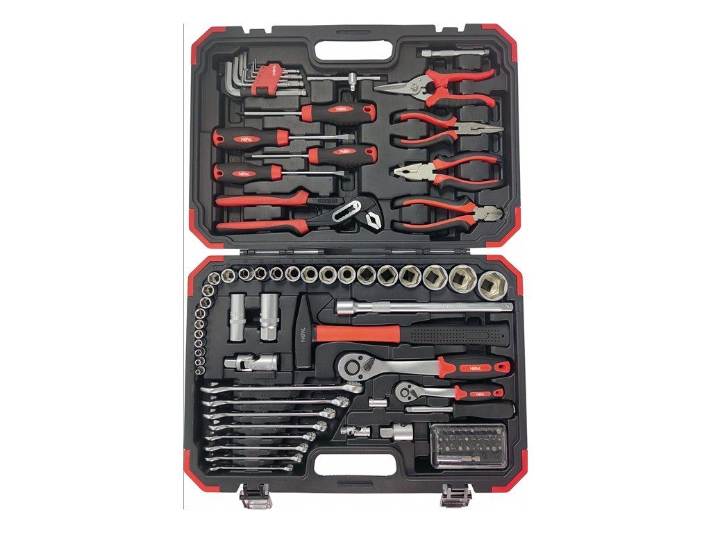 skrutkovačov (5,5 / 6,5 mm ), 1 kus z nasledujúcich krížových skrutkovačov (PH) ( veľkosť 1 / 2) , 1 pár klieští na vodné čerpadlo (250 mm) , 1 pár kombinovaných klieští (160 mm), 1 pár bočných klieští (160 mm ), 1 pár plochých klieští (160 mm), 1 pár univerzálnych nožníc (180 mm), 1 kladivo pre obrábanie (300 g) s plastovou rukoväťou. Dodávané v plastovom kufríku.