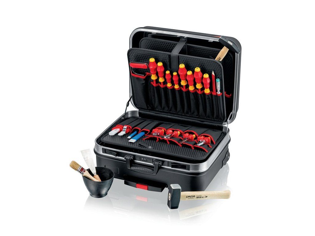 1 bočné kliešte 160 mm s VDE izoláciou ( Knipex) 1 odizolovací nástroj 160 mm s VDE izoláciou (Knipex) 1 odizolovací nástroj na káble 165 mm s VDE izoláciou, pracovný rozsah 8 - 28 mm Ø (Knipex) 1 nôž na káble 185 mm (Knipex) 1 skrutkovač na skrutky s drážkou veľkosti 2,5 / 3,5 / 5,5 / 6,5 mm s VDE izoláciou (Wera) 1 skrutkovač na skrutky s krížovou hlavou (PH) veľkosti 1 / 2 s VDE izoláciou (Wera) 1 skrutkovač na skrutky s Pozidriv (PZD) veľkosti 1 a 2 1/2 s VDE izoláciou (Wera) 1 jednopólová skúšačka napätia 3,0 x 70 mm, pracovný rozsah 150 - 250 V AC (Wera) 1 murársky sekáč 250 mm (Rennsteig) 1 elektrikársky sekáč 250 x 10 mm (Rennsteig) 1 tesárska ceruzka 1 kužeľovitý miešací pohár na omietku (90 / 125 mm Ø) (Picard) 1 plochý štetec široký 40 mm (Picard) 1 zámočnícke kladivo 300 g (Picard) 1 kladivo 1000 g (Picard) 1 maliarska špachtľa s drevenou rukoväťou, šírka 40 mm (Maurer Freund) 1 malá oblúková píla PUK®, dĺžka čepele 150 mm <*-01-*> Tvrdý kufor: max. nosnosť 20 kg, hliníkový rám po celom obvode, 2 kovové prepínacie zámky a 3-miestny kombinovaný zámok, integrovaný podvozok s teleskopickou rukoväťou a ľahko sa pohybujúcimi kolieskami. Vonkajšie rozmery: 515 x 430 x 280 mm (Š x H x V). Ďalšie technické špecifikácie: Výška: 280 mm , Hĺbka: 430 mm , Šírka: 515 mm