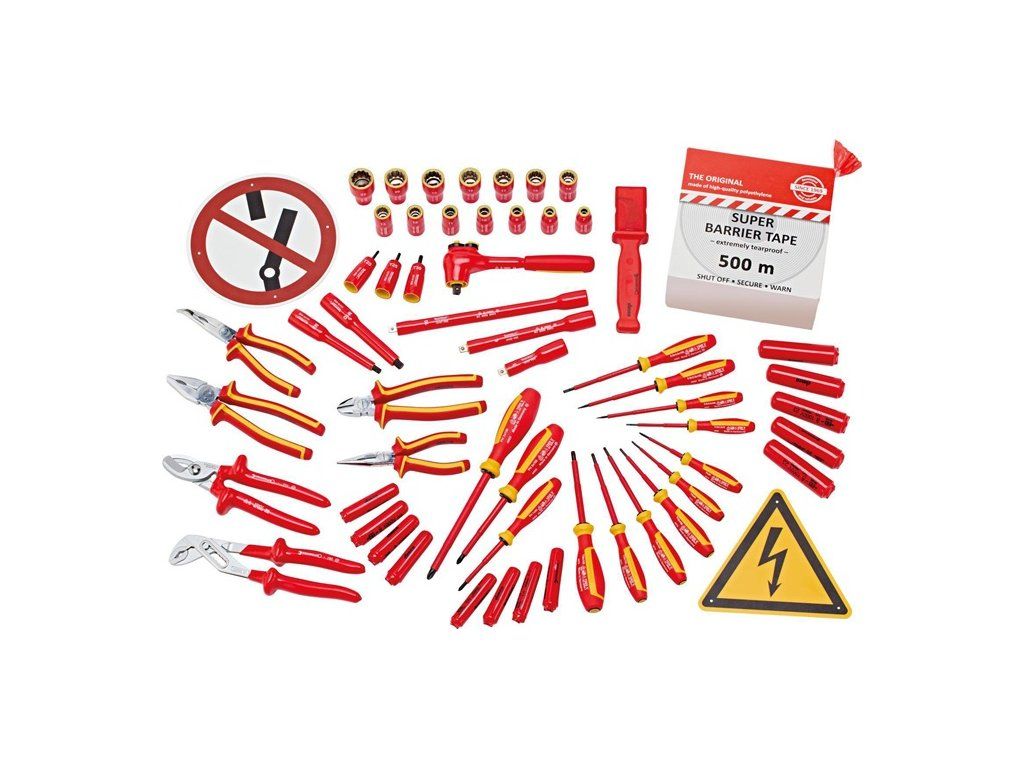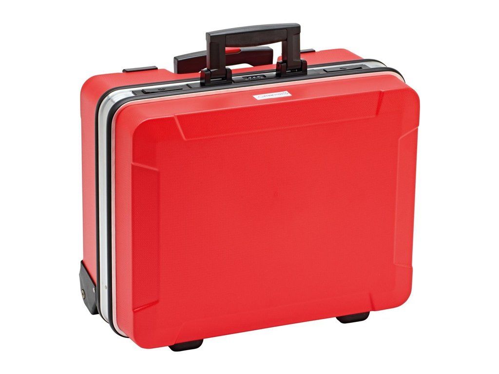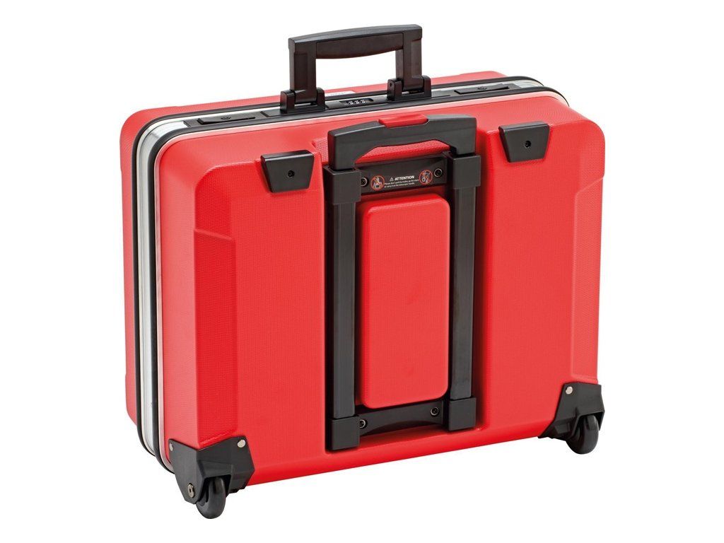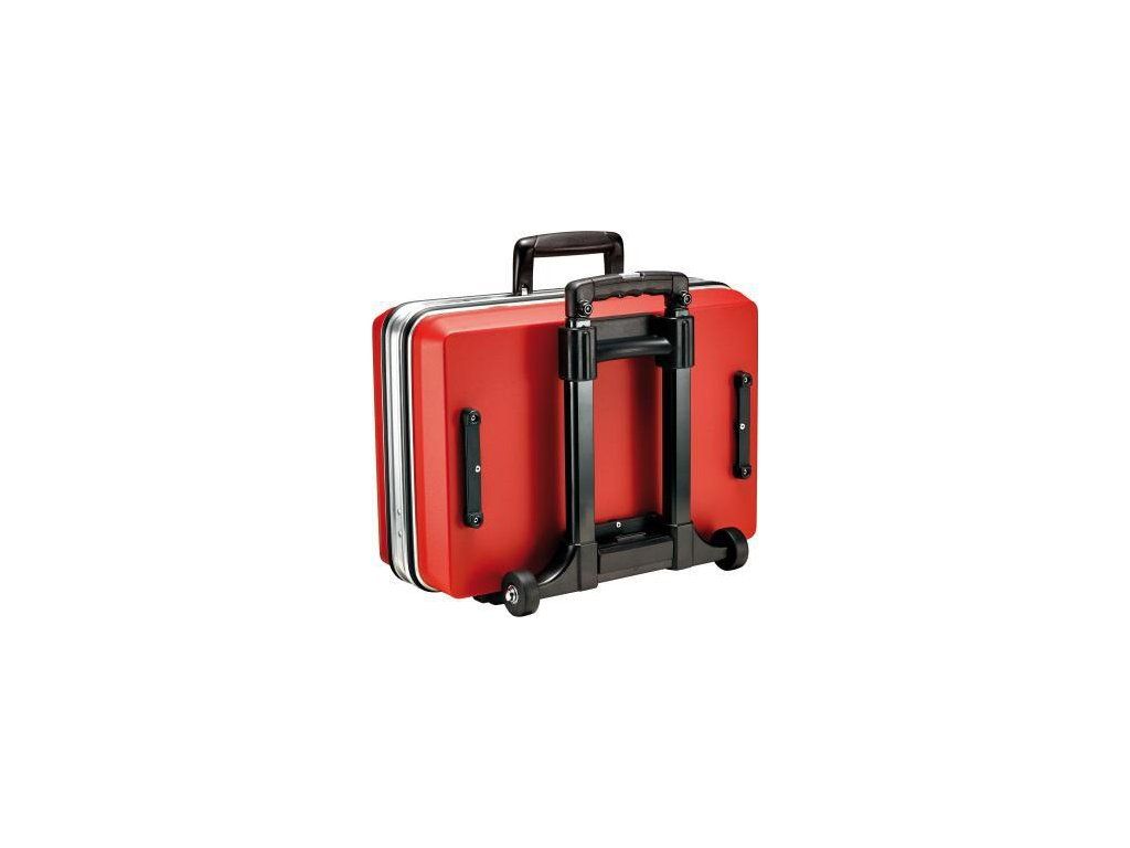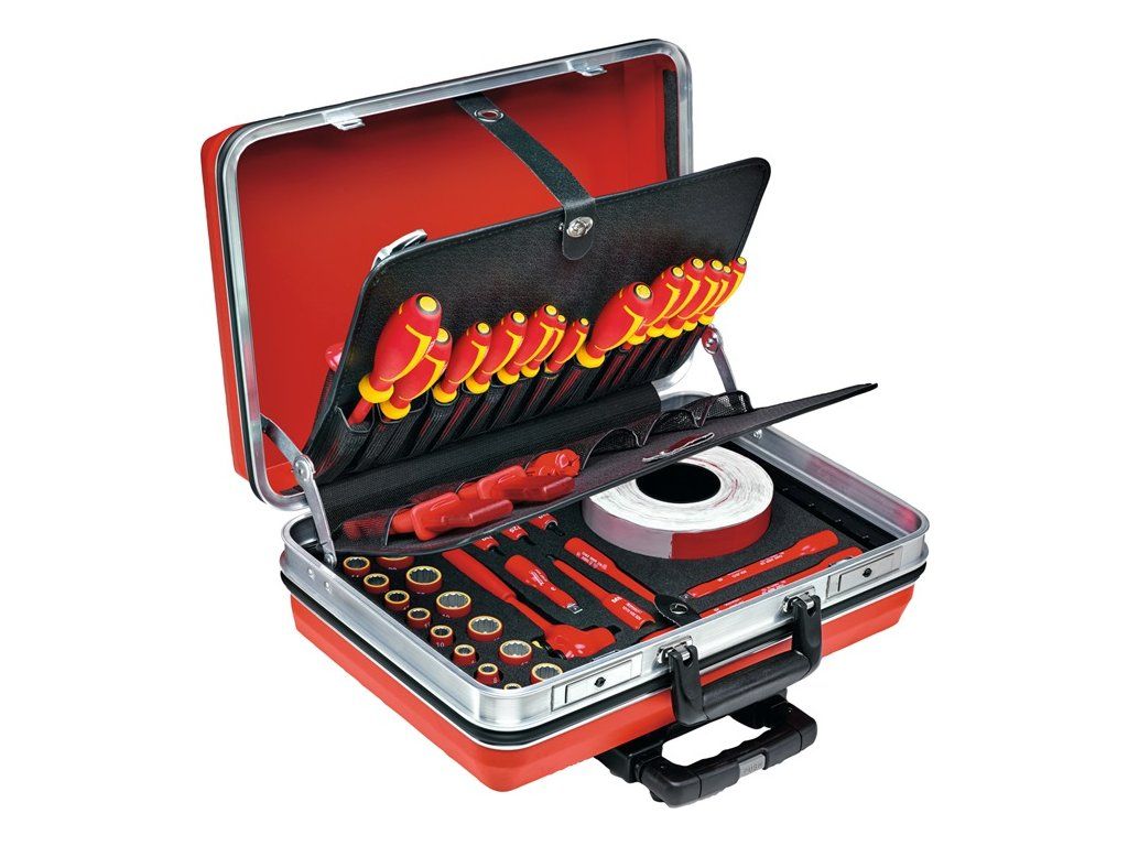 48-dielna sada · robustný kufrík z ABS s hliníkovým rámom, ľahko sa pohybujúcimi kolieskami, teleskopickou tyčou a uzamykateľnými sklopnými zámkami · tvarovo stabilné vnútorné priehradky s ochranou proti nárazom, ergonomická rukoväť, číselný zámok Proficode · variabilná spodná priehradka s hliníkovými priečkami, dvoma vyberateľnými kartami na náradie (15 + 22 priehradiek) a samostatným priestorom na dokumenty · max. nosnosť 30 kg · B certifikované VDE podľa DIN EN 60900B