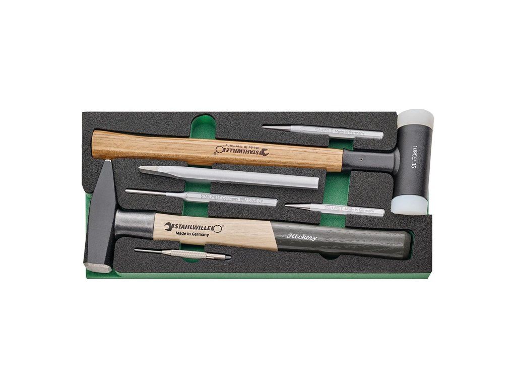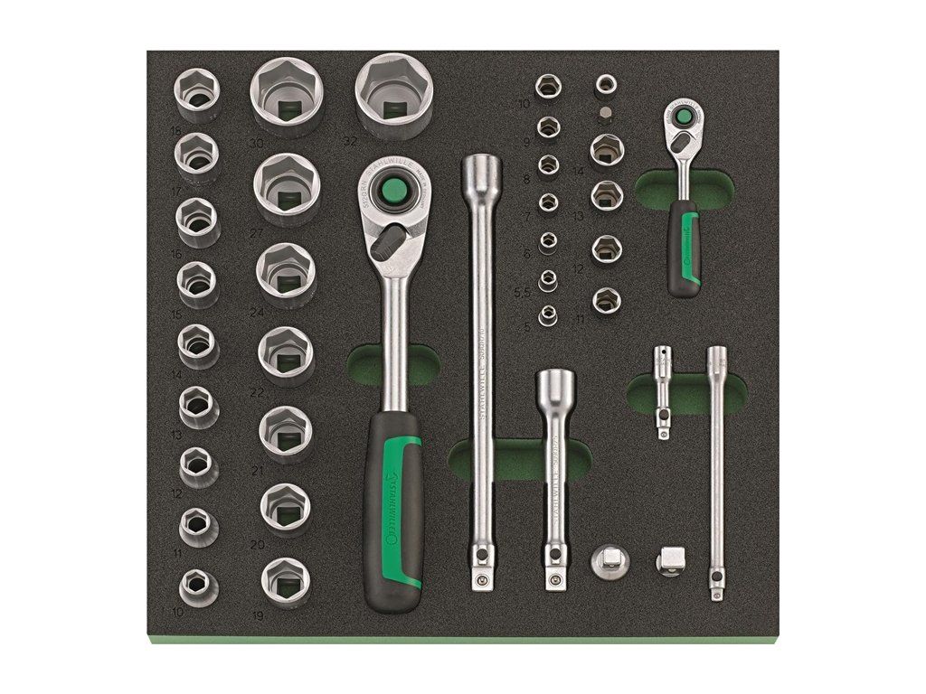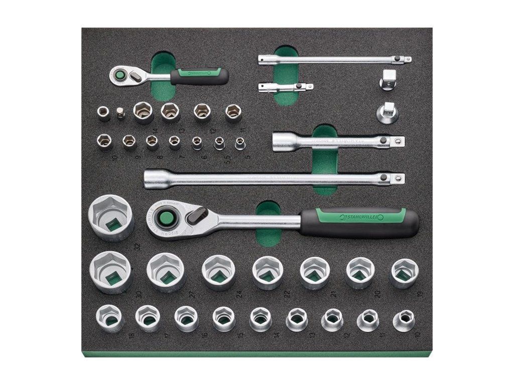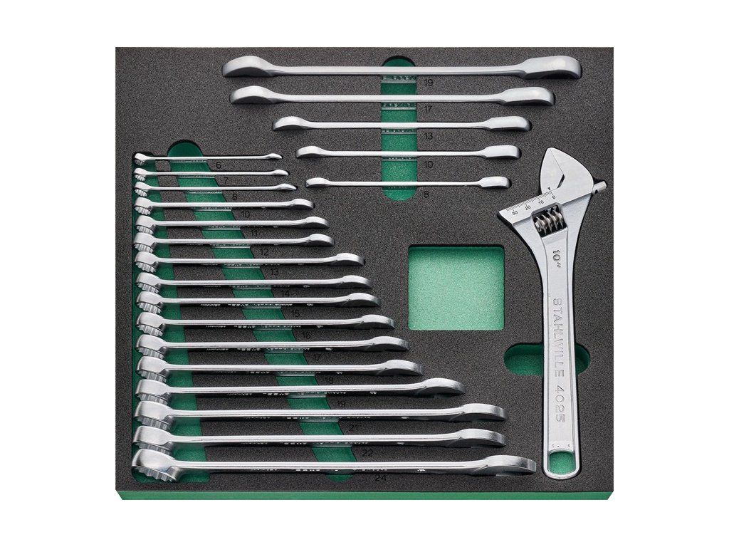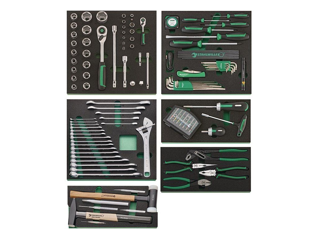 na vybavenie pracovných stolov, dielenských vozíkov a vozíkov na náradie v priemyselnom použití · komplexná zostava pre najvyššie nároky: QR ráčny kľúče s jemným ozubením s predĺženiami, nástrčné kľúče do 32 mm, skrutkovače s ráčnym mechanizmom a krabička na bity, skrutkovače, rôzne kliešte a mnoho ďalšieho · vyrobené z vysoko kvalitnej chrómovej zliatiny s pochrómovaným, korózii odolným povrchom pre dlhú životnosť · patentovaný systém rýchleho uvoľnenia QuickRelease · náradie je bezpečne integrované do vložiek TCS – odolných, chemikáliám odolných penových vložiek s presnými výrezmi pre náradie a výraznou signálnou plochou pre rýchlu kontrolu kompletnosti