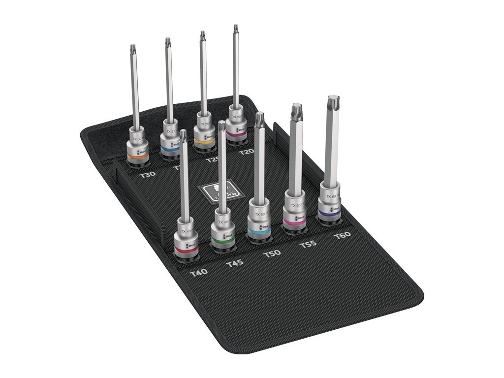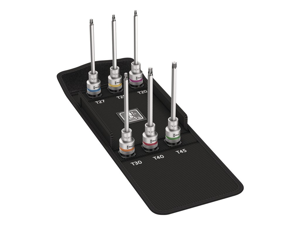 12,5 mm (1/2″) štvorhranný pohon -s pridržiavacou funkciou a systémom farebného označovania - z legovanej nástrojovej ocele - matne pochrómovanýpre skrutky s vnútorným profilom TORX®