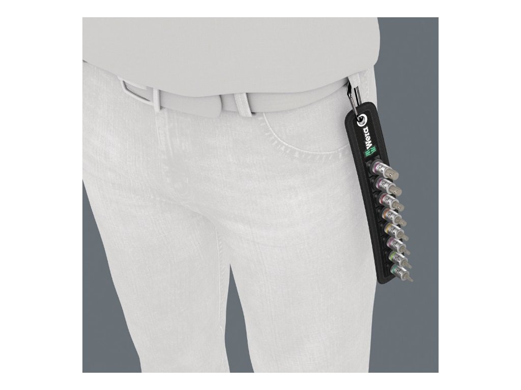 6,3 mm (1/4″) štvorhranný pohon - robustný textilný popruh, vrátane karabíny - flísový podklad a pásy suchého zipsu na jednoduché pripevnenie, napr. k policiam, dielenským vozíkom a systému na prepravu náradia Wera 2go - hladko sa otáčajúci mechanizmus na bezpečné uloženie a jednoduché vybratieDodatočné parametre
