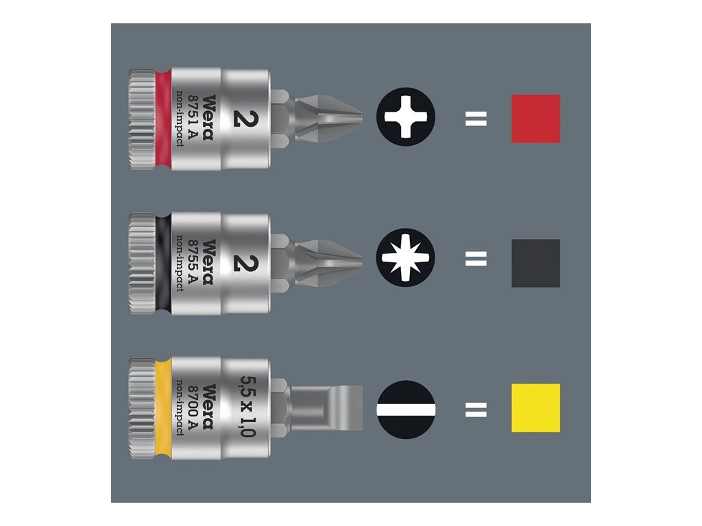 Zásuvka na bity s pohonom 1/4″ - s vyhľadávačom nástrojov ″Take it easy″ s farebným kódovaním podľa veľkosti - na rýchle a jednoduché nájdenie požadovaného nástrojaDodatočné parametre