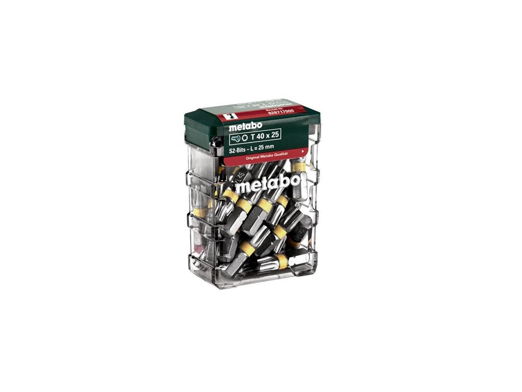 Pozostáva z: S 2 bity - L = 25 mm T 40 x 25 bitov z chróm-vanádiovej ocele (kvalita S2) - bity s farebným označením - vysokokvalitné - robustný box v špeciálnom dizajne Metabo - so závesom na eurootvorDodatočné parametre