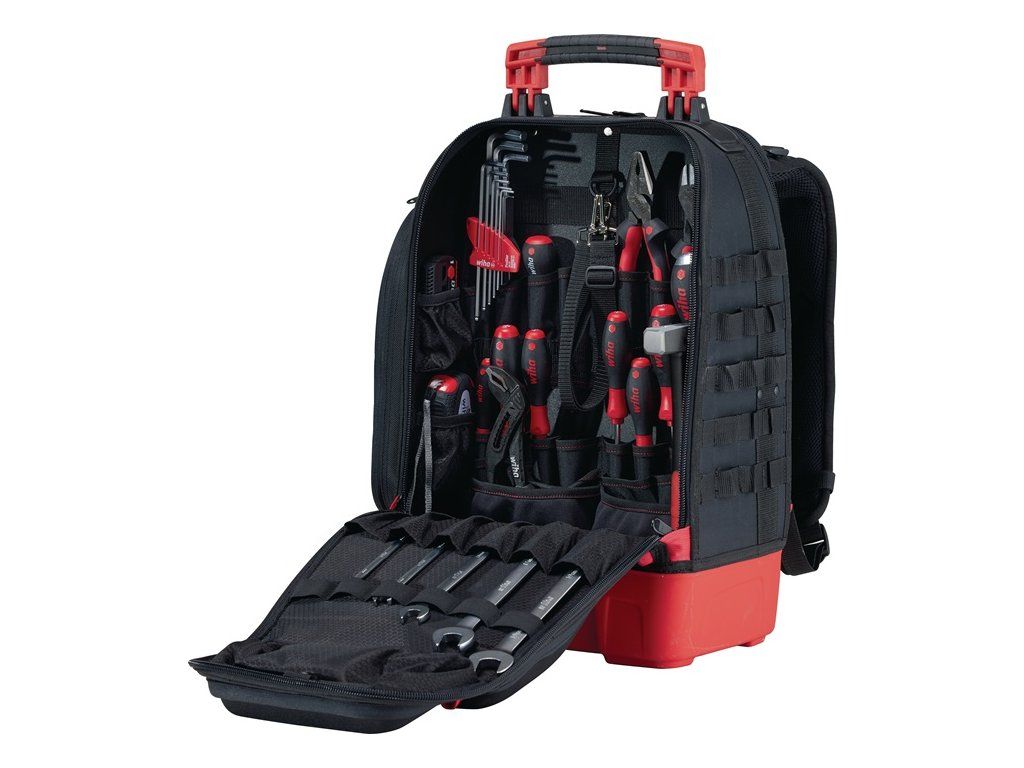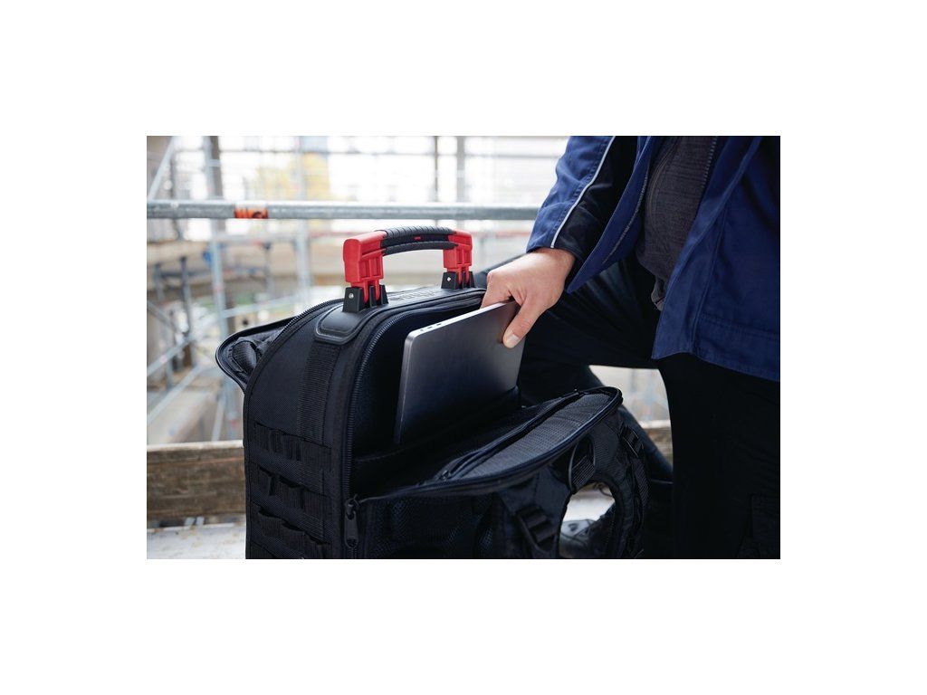 v robustnom batohu na náradie, so systémom priehradiek na prehľadné uloženie a jednoduché vyberanie náradia, 77 úložných priestorov a 30 flexibilných možností upevnenia na prispôsobenie ďalšieho náradia a príslušenstva - robustný základný plášť pre stabilitu (batoh bezpečne stojí aj v otvorenom stave) - odolný materiál (chráni obsah aj vo vlhkých a špinavých pracovných podmienkach) - samostatná priehradka na notebook a dokumenty, ďalšia chránená priehradka na drobné predmety, ako je mobilný telefón, okuliare - nastaviteľné a priedušné nosné prvky a protišmyková rukoväť na pohodlnú prepravuDodatočné parametre