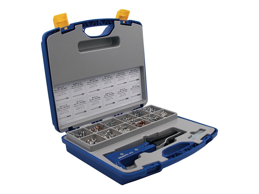 Sortiment slepých nitov box na nity 942 kusov NTX a slepé nity hliník/oceľ, meď/oceľ v plastovom kufríku GESIPA