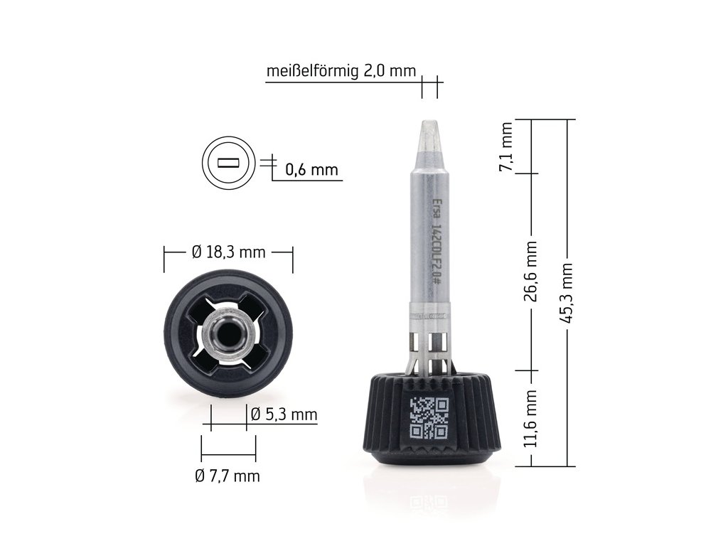s patentovanou povrchovou úpravou ERSADUR - navrhnutá pre náročné priemyselné aplikácie na dlhodobé používanie - uvoľňovač Tip'n'Turn na rýchlu a jednoduchú výmenu hrotu, aj keď je horúci, ručne alebo pomocou odkladacieho stojana - čiarový kód na jednoduchú integráciu spájkovacieho hrotu do spájkovacích programov kokpitu i-CON TRACE - Pasuje pre:Dodatočné parametre