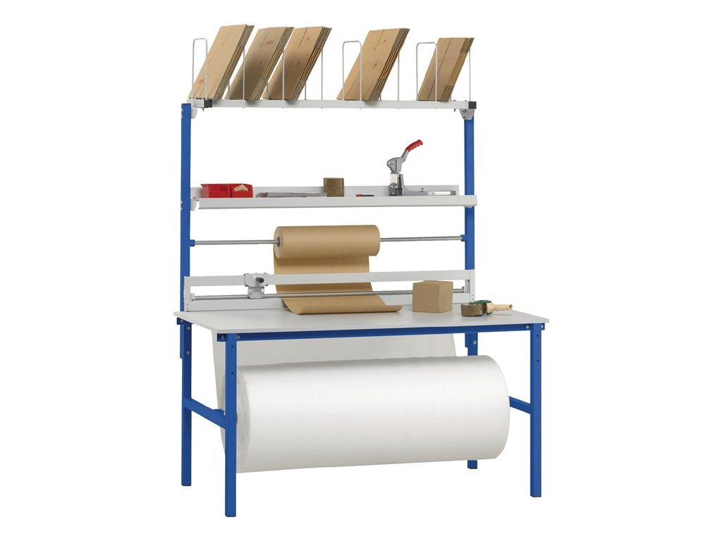 Robustná konštrukcia stola - nohy stola práškovo lakované vo farbe genciánová modrá, RAL 5010 - vrchná plocha potiahnutá plastom svetlosivá, RAL 7035 - zásobník na rozšírenie stola s 8 vkladacími držiakmi na boxy - odvíjacie zariadenie medzi stĺpikmi na držanie roliek papiera a fólie (max. priemer rolky 30 cm, max. hmotnosť rolky 20 kg) priemer rolky 30 cm, max. hmotnosť rolky 20 kg) - Odkladacia polica s hĺbkou 253 mm - Bezpečnostné rezacie zariadenie so šírkou rezu 1,25 m - Odvíjacie zariadenie pod stolom na papier alebo fóliu (max. priemer rolky 75 cm, max. hmotnosť rolky 100 kg)Dodatočné parametre
