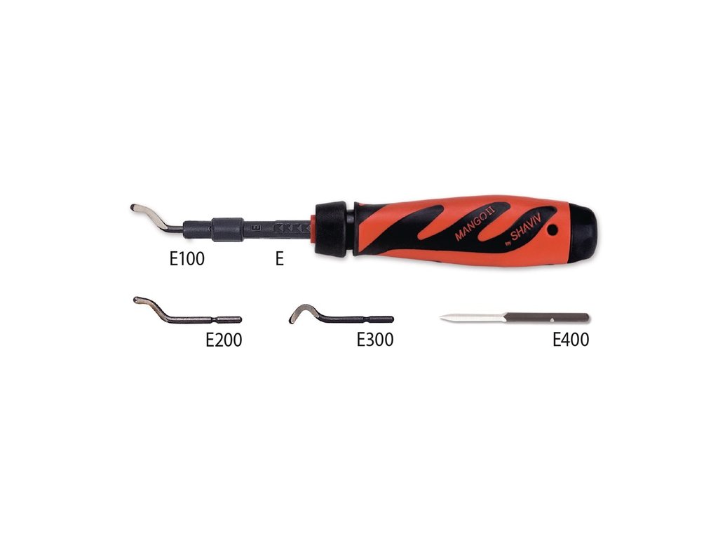 na odstraňovanie otrepov, drážok a hráns rukoväťou Mango II, držiakom nožov E, nožmi E100, E200, E300 a trojhrannou škrabkou E400