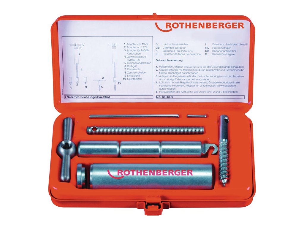 Jednoduchá demontáž kartuší v zmiešavacích batériách - 4 adaptéry s háčikom, závitovým tŕňom, skrutkou alebo nitovým držiakom pre kartuše pred rokom 1979, od roku 1979 aj kartuše MOEM a nástroj na demontážDodatočné parametre