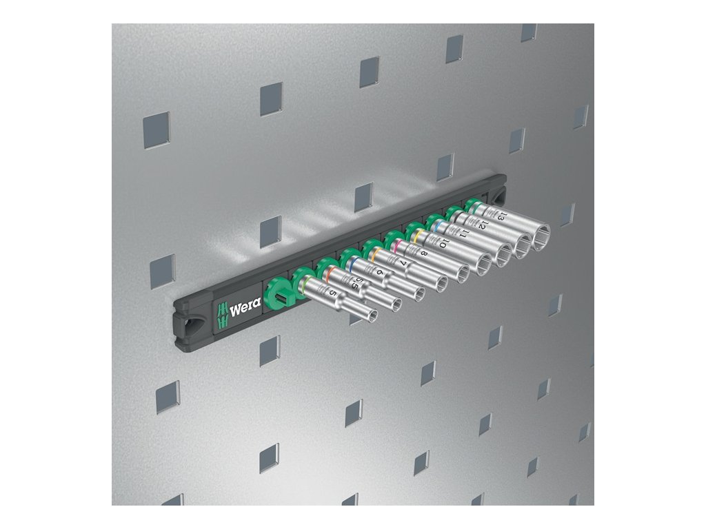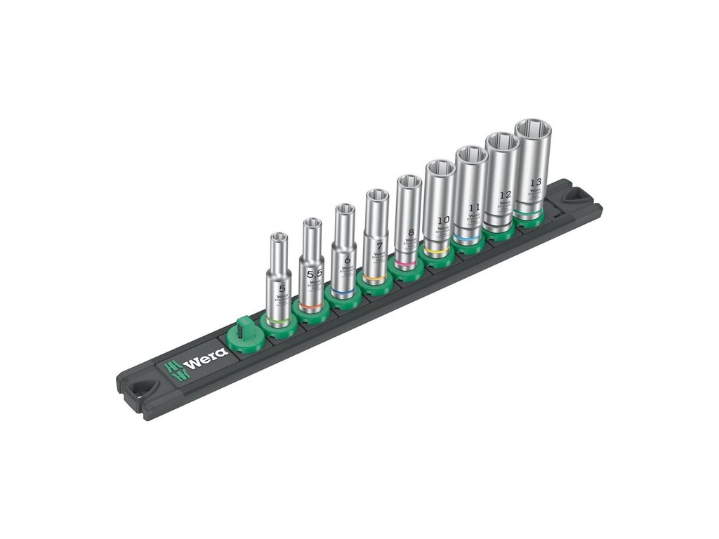 Magnetická lišta na nástrčné kľúče s 9 dlhými vložkami na ručné a strojové kľúče (bez nárazu) - 1/4". Hladko sa otáčajúci mechanizmus zaisťuje bezpečné uchytenie a jednoduché vybratie nástrčných hlavíc. Dlhé nástrčné kľúče na ručné a strojové kľúče 1/4″ (ISO 2725 časť 3) od spoločnosti Wera na použitie pri ručnej a strojovej práci (bez nárazu), a to aj pri hlboko uložených skrutkových spojoch a vyčnievajúcich závitových tyčiach. S vyhľadávačom nástrojov Take it easy s farebným označením podľa veľkosti - na rýchle a jednoduché nájdenie požadovaného nástroja. Ľahko uchopiteľný aj pre mastné ruky. So šesťhranným profilom a drážkou na zachytenie guľôčky. Šesťhranný profil umožňuje prenos veľkých síl a menej zaťažuje hrany matice alebo hlavy skrutky ako dvanásťhranný profil. Vďaka malému uhlu natočenia ráčny s jemným ozubením je použitie šesťhranného profilu zbytočné aj v stiesnených priestoroch. Pre skrutky a matice so šesťhrannou hlavou. Magnetická lišta sa dá dočasne pripevniť na kovové povrchy a má bezpečnú funkciu zaistenia a odistenia matice vďaka funkcii "twist-to-unlock".Dodatočné parametre
