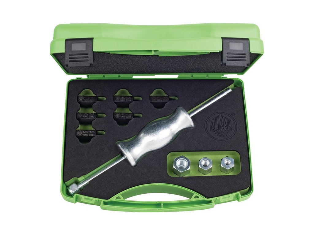 s ergonomicky tvarovaným klzným kladivom - na vyberanie a vyťahovanie dielov s vnútornými závitmi - vhodné pre všetky vnútorné vyťahovače KUKKO - komplet s adaptérom pre závity M3 až M10 a špeciálnym držiakom na skrutky s drážkou na vyťahovanie kužeľových alebo kolíkových čapovPoužitie: na vyťahovanie tesne priliehajúcich guľôčkových ložísk, vonkajších krúžkov guľôčkových ložísk a puzdier, na vyťahovanie dielov so stredovými závitovými otvormi, napr. kužeľových a valcových čapov. Napr. kužeľové čapy, kolíkové čapy atď.