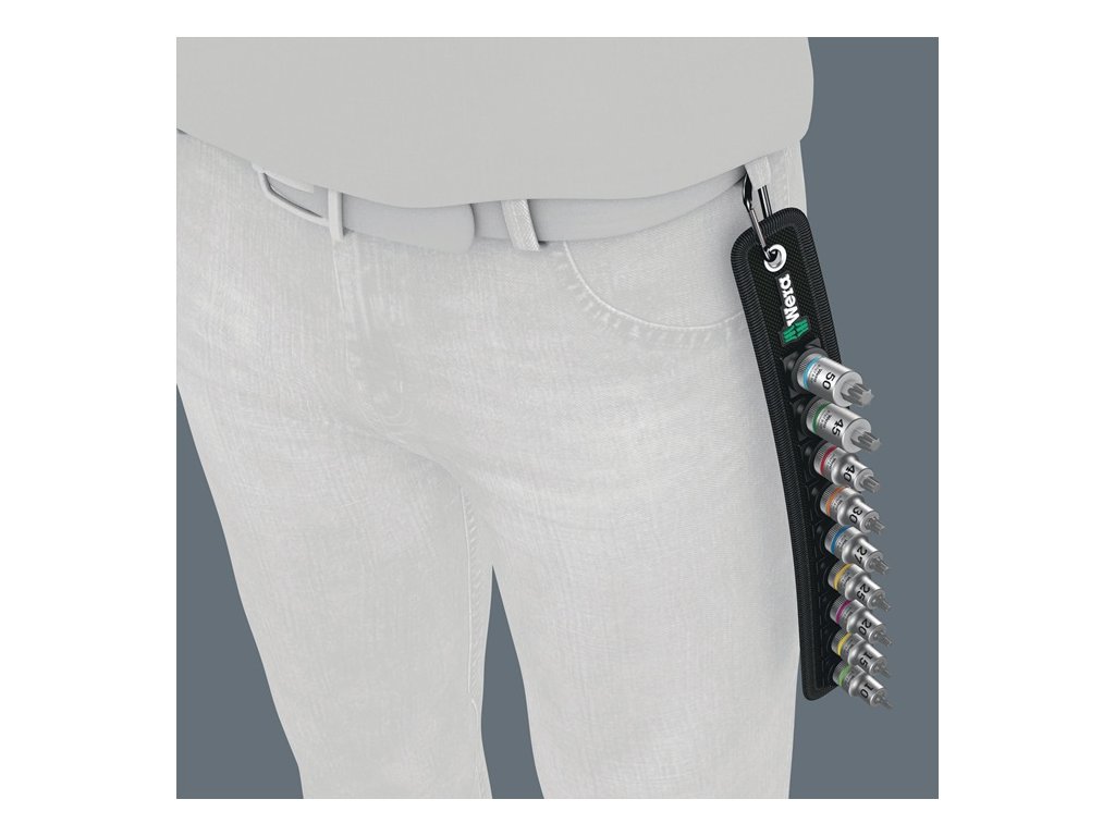 robustný textilný opasok v typickom dizajne Wera s 9 bitovými zásuvkami na veľmi malom priestore - hladko sa pohybujúci rotačný mechanizmus zaisťuje bezpečné uchytenie a jednoduché vybratie zásuviek - s vyhľadávačom nástrojov ″Take it easy″ s farebným kódovaním podľa veľkosti - na rýchle a jednoduché nájdenie požadovaného nástroja - vrátane karabíny na pripevnenie na pútko na opasok alebo do vrecka - obzvlášť krátky, zásuvkami na bity s výhodami technológie bitov Wera - zásuvkami na bity s funkciou pridržiavania pre obzvlášť pohodlné skrutkovanie a znížené riziko straty skrutky pri podávaní k obrobku - s flísovým podkladom a pásikmi suchého zipsu na jednoduché upevnenie, napr. na stenu, policu, obrobok atď.napr. na stenu, policu, dielenský vozík a systém na prepravu náradia Wera 2goDodatočné parametre
