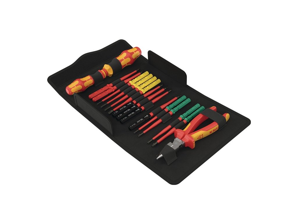17-dielna súprava nástrojov na prácu v beznapäťovom stave a pod napätím do 1 000 V - všetky nástroje kusovo testované podľa IEC 60900 pri 10.000 V - 2 ručné držiaky: - 837 i VDE s račňovou funkciou, - 817 VDE = oba vhodné pre vymeniteľné čepele Wera VDE - 14 vymeniteľných čepelí VDE (157 mm), niektoré so zníženým priemerom čepele pre nízko položené skrutkové a pružinové prvky - špičaté kombinované kliešte Knipex VDE 08 26 185: vysokopriepustný silový kĺb - rezné hrany na mäkký, stredne tvrdý a tvrdý drôt - frézovaná drážka na bezpečné uchopenie malých obrobkov - pochrómované, s izolovanými viaczložkovými rukoväťami - vyhľadávač nástrojov Take it easy: farebné označenie + laserom vyryté označenie veľkosti na rýchle nájdenie - v robustnom puzdre na opasok s fleecovou zónou na zadnej strane - upevnenie pomocou suchého zipsu na Wera 2go, dielenský vozík, stenu alebo policuDodatočné parametre