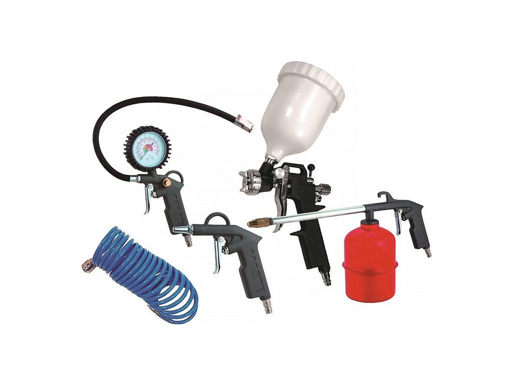 pozostáva z: striekacia pištoľ s prietokovým pohárom - vyfukovacia pištoľ - manometer na meranie tlaku v pneumatikách - striekacia pištoľ - 5 m špirálová hadica - univerzálne uloženieDodatočné parametre