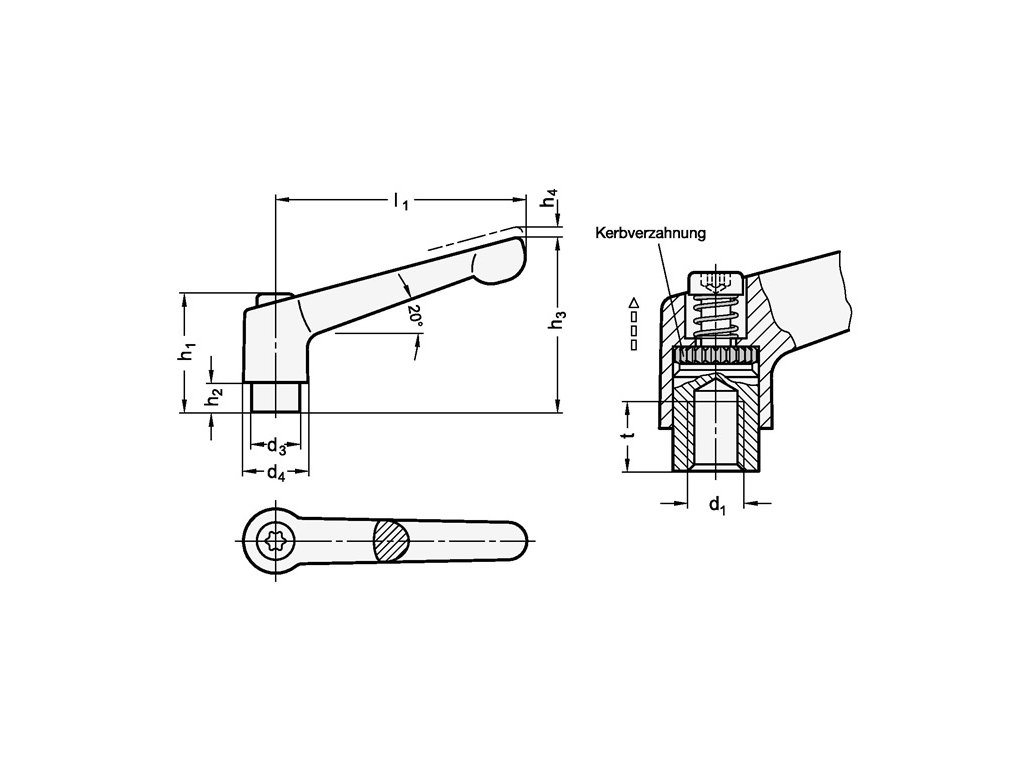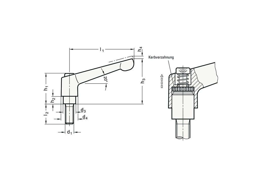 sa prednostne používajú, ak je rozsah upínania obmedzený a vyžaduje sa špecifická upínacia poloha - zdvihnutím (potiahnutím) rukoväte sa uvoľní ozubenie a upínacia páka sa môže vyklopiť do najvýhodnejšej upínacej polohy - po "uvoľnení" sa rukoväť automaticky opäť zapne - telo rukoväte - tlakový zinkový odliatok - závitové puzdro a poistná skrutka - leštená oceľDodatočné parametre