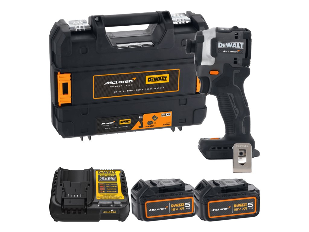 - DCF85MP2T: Súprava obsahuje kompaktný rázový skrutkovač DCF85M DEWALT X McLaren18 V XR, s 2 akumulátormi s kapacitou 5 Ah a 4 A nabíjačkou DCB1104 v kufri kompatibilnom so systémom TSTAK.