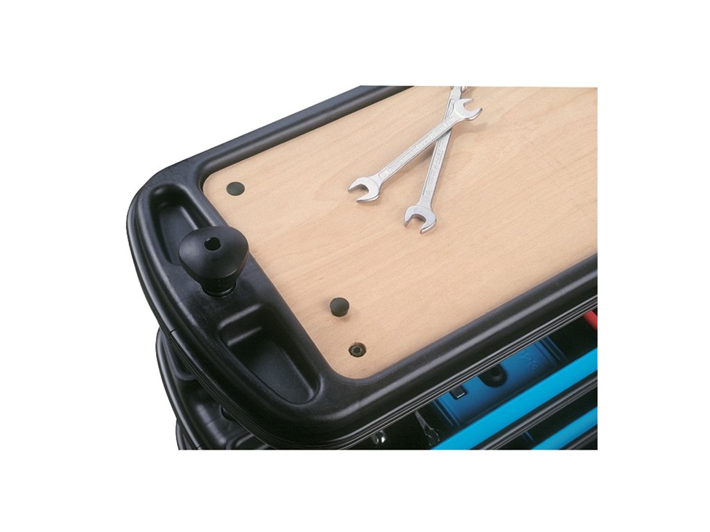 Vyrobené z oceľového plechu - Stolová doska s vymeniteľnou drevenou doskou z bukového multiplexu - Kolieska s lepšími jazdnými vlastnosťami po nerovnom povrchu - Stolová doska a 2 priehradky na náradie sa dajú spustiť a zablokovať - Otáčacie stĺpikyDodatočné parametre