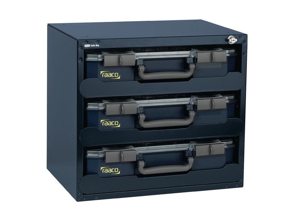 Zásobník na sortiment W452xD405xH330mm 3 priehradky s boxmi na sortiment PP/PC (boxy)/galv. oceľový plech (trezor) RAACO